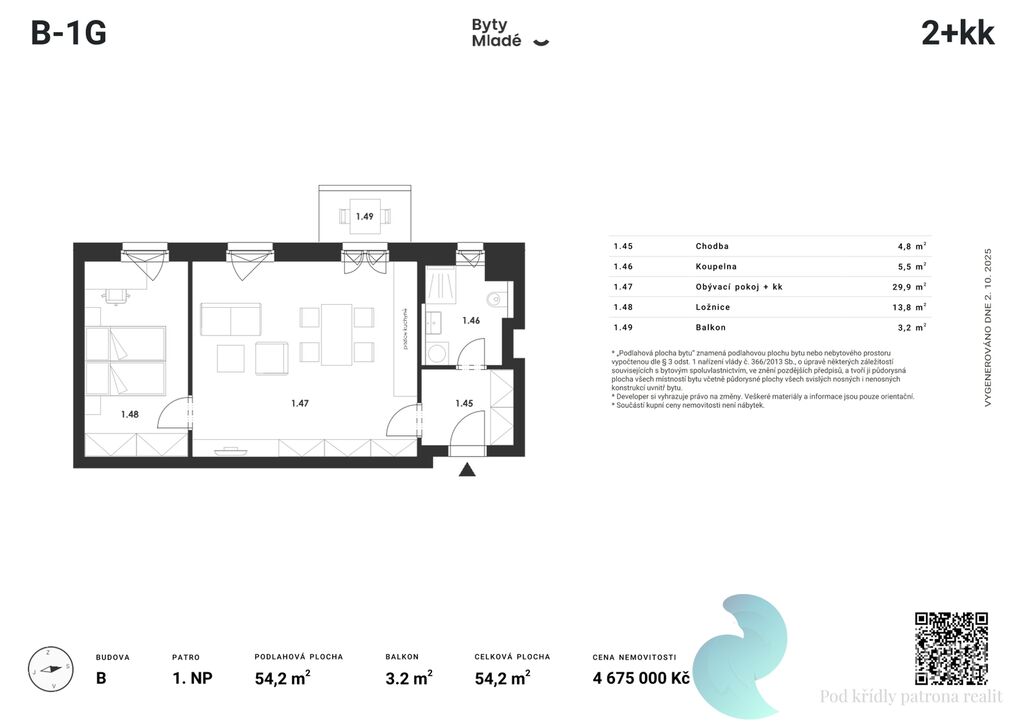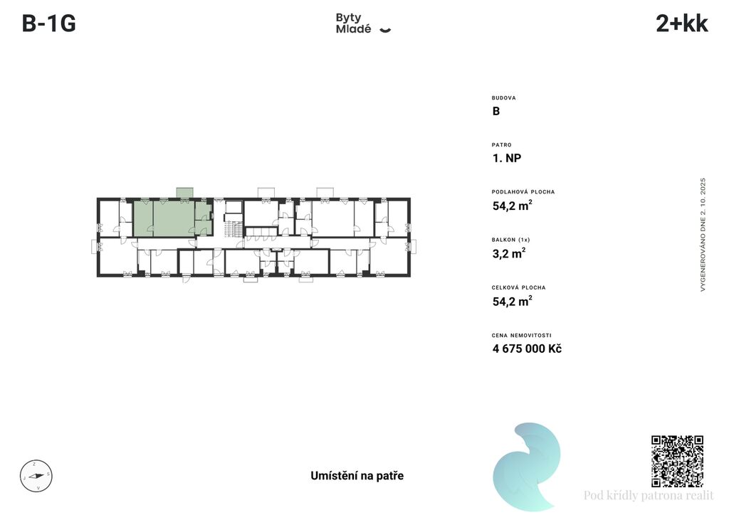 Nabízený byt č. B-1G o dispozici 2+kk, výměře 54,2 m2 a balkonem 3,2 m2, se nachází v prvním patře budovy B. Disponuje vstupní chodbou, koupelnou, obývacím pokojem s kuchyňským koutem a neprůchozím pokojem.