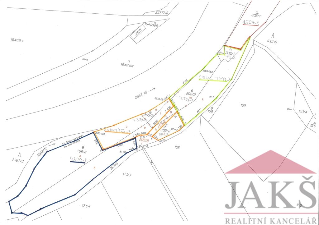 1 – Modrá varianta: pozemky o celkové výměře 4.420 m2 (největší rovinatá louka s původní studnou a remízkem se stromy ve svahu oddělující obecní cestu) za cenu 1.326.000 Kč.