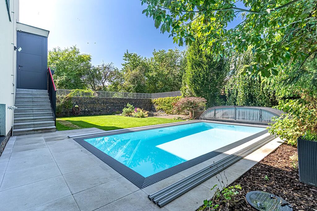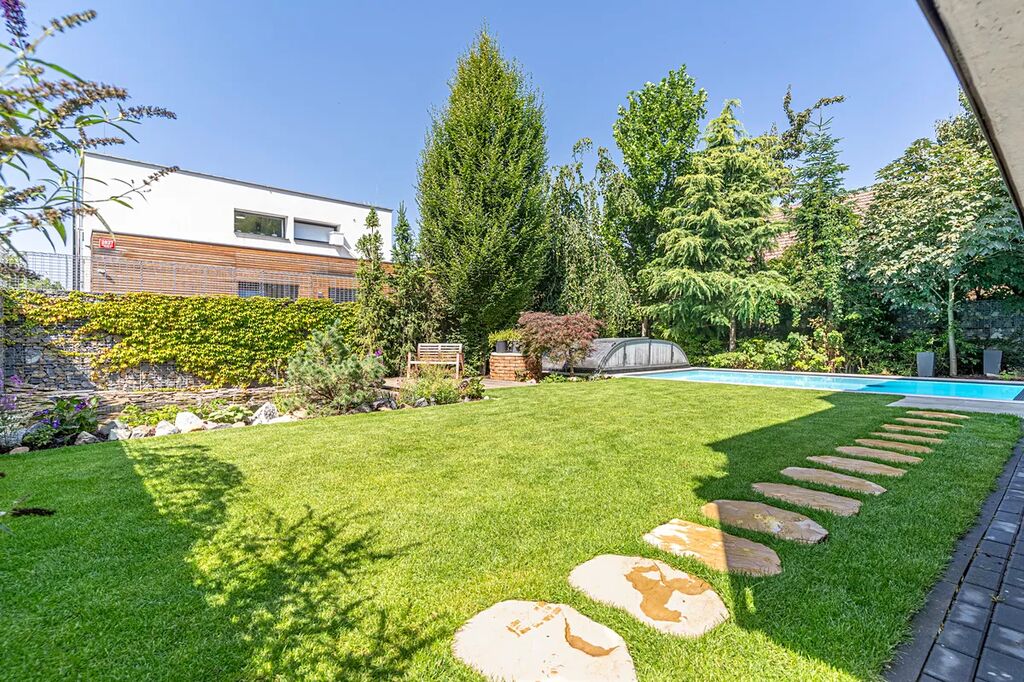 V zadní části zahrady je samozřejmě bazén s ohřevem, ale i relaxační jezírko s rybami.