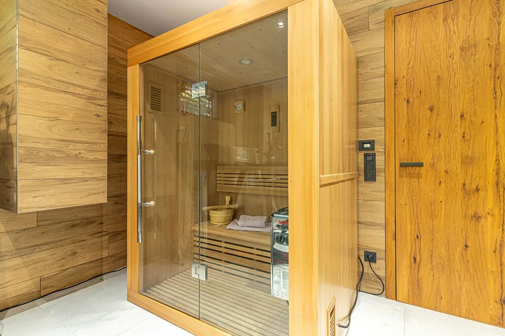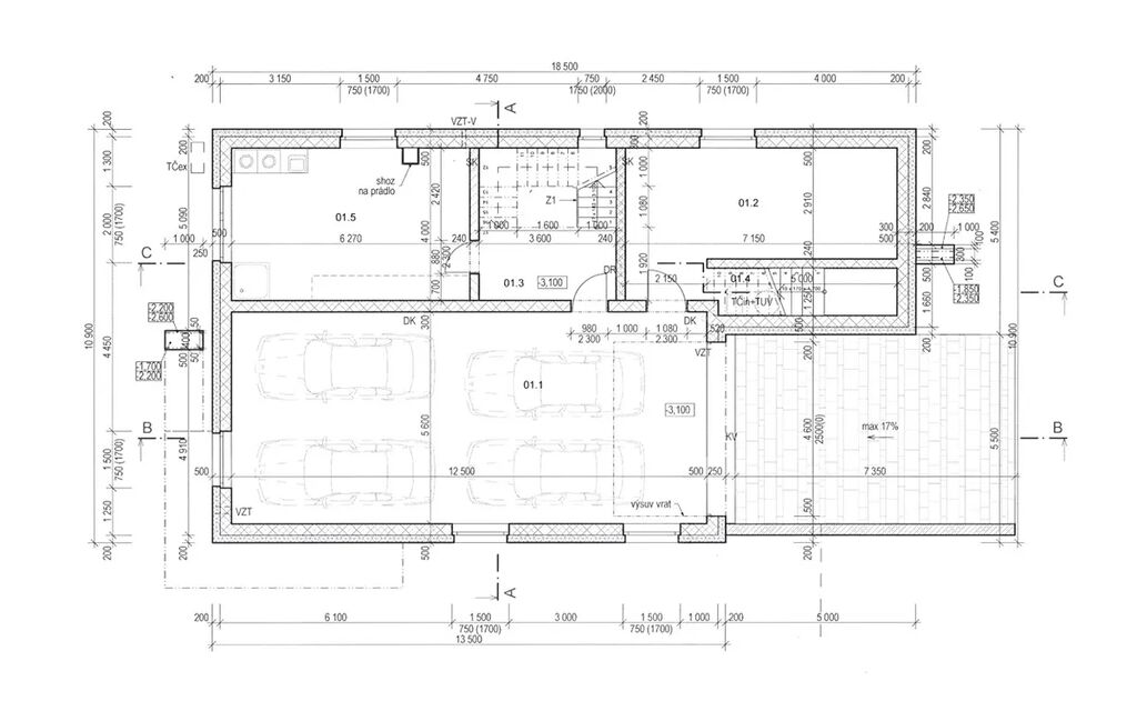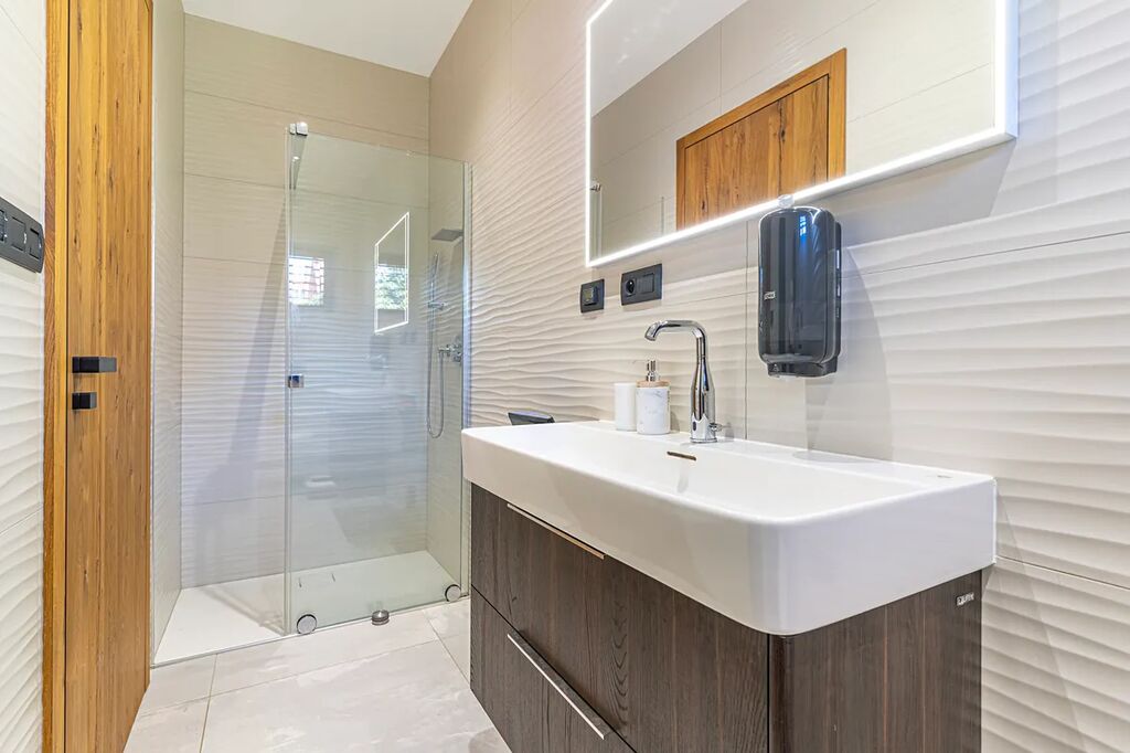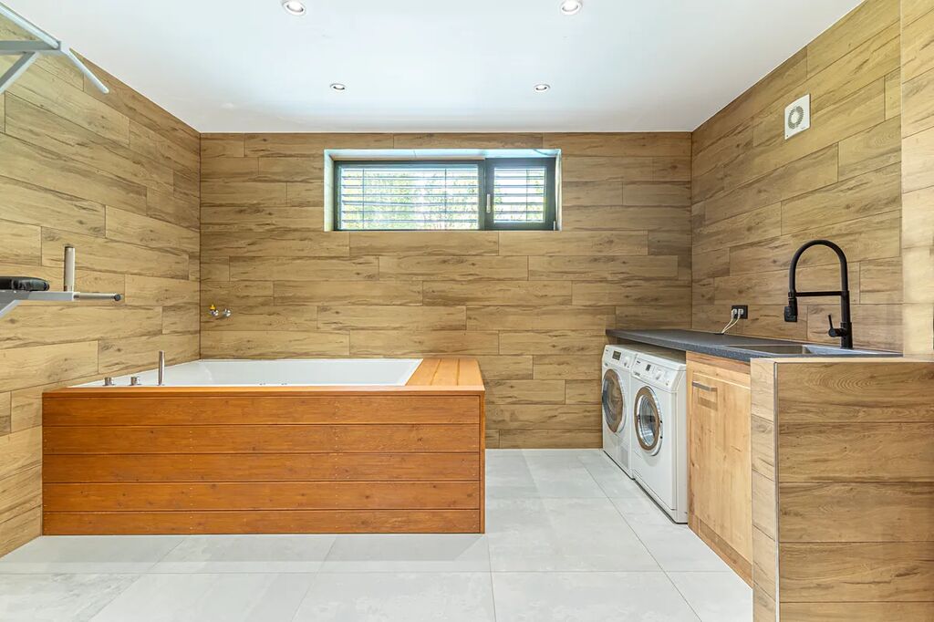 V prvním nadzemním podlaží se nachází prostorný obývací pokoj s prostorem pro jídelní stůl, plynule navazující na kuchyň s ostrůvkem, jež je osazena kvalitní kuchyňskou linkou zn. Sykora. Tato centrální část domu nabízí velkorysých 75,5m2, přičemž v letních měsících obytnou část rozšiřuje krytá terasa s výměrou dalších 27,3m2. Na tomto podlaží se dále nachází prakticky situovaná pracovna (13,6m2). Dále koupelna osazená sprchovým koutem, umyvadlem a toaletou. V druhém nadzemním podlaží najdeme celkem čtyři ložnice. První tři s výměrou každá 23m2 a čtvrtá ložnice disponuje i vlastní šatnou (celkem 30,4m2). Na tomto podlaží má budoucí majitel k dispozici další koupelnu, tentokrát osazenou vanou, prostorným sprchovým koutem a toaletou. Praktičnost vybavení potvrzuje další šatna (7m2). V suterénu najdeme provozní technickou místnost, chcete-li prádelnu, kde zbyl prostor i pro menší saunu i whirpool (25m2). Prostorný sklad pro uložení nejrůznějšího vybavení a garáž pro 4 vozy (70m2). Mimo to je možnost parkovat další dvě auta pod krytým stáním na pozemku.