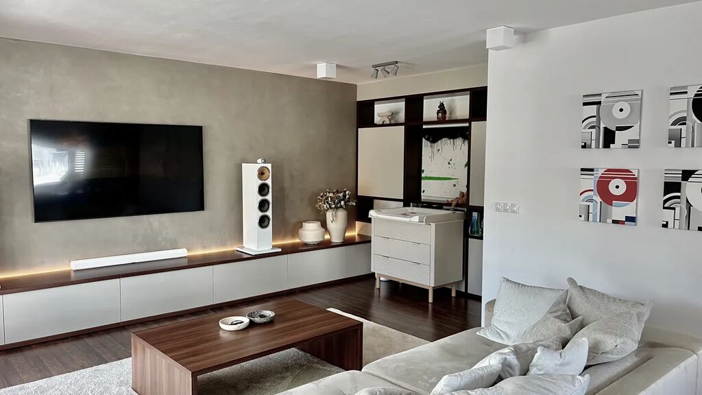 Prostřední patro zahrnuje velký obývací prostor s kuchyní a jídelnou, denní koupelnu se sprchovým koutem a wc, skryté vestavěné skříně v chodbě a úklidovou místnost pod schody. Je odsud přístup na zahradu, jenž nabízí absolutní soukromí díky vysokým cypřišům a prostorné částečně kryté terasy, které přímo vybízí ke grilování a relaxu.