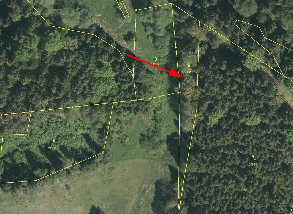Prodáme pozemek, louku s porostem stromů (možno vytěžit) v k.ú. Horní Dvořiště, parc.č. 2168.