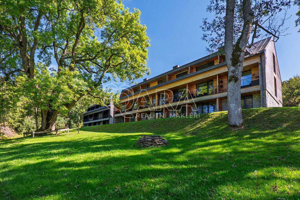 Byt je orientován na severozápad a nabízí jedinečné výhledy do okolní přírody. Interiér je zařízen na míru ve vysokém standardu, kuchyňské spotřebiče značky AEG, podlaha z masivu. Dispozice zahrnuje vstupní chodbu s vestavěnou skříní, obývací pokoj s kuchyňským koutem a vstupem na terasu, patrovou manželskou postel umístěnou v klidové zóně, koupelnu se sprchovým koutem a toaletou. Úložné prostory jsou řešeny prakticky a s maximálním využitím místa. K bytu náleží prostorný sklep přímo naproti vstupu do jednotky a venkovní parkovací stání.