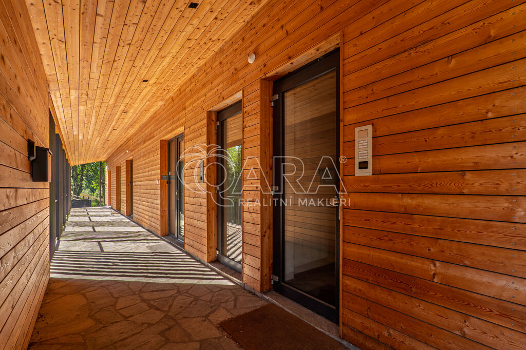 Designový byt 1+kk o velikosti 30,1 m² s terasou (5,2 m²), sklepem (2,2 m²) a vlastním venkovním parkovacím stáním. Byt umístěný v 1. PP bytového domu Jasan s přímým vstupem na vlastní terasu a poté do zahrady je součástí projektu Šumavské Stráně v lokalitě Hojsova Stráž – Brčálník.