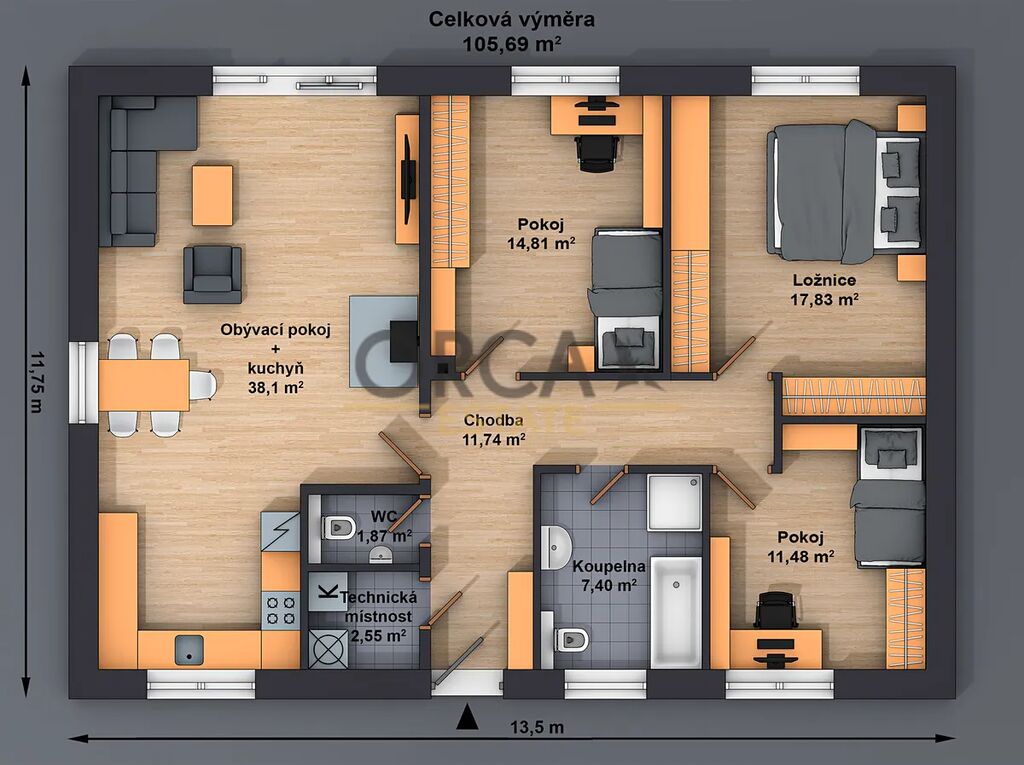 •	dětský pokoj č. 2 (orientace do zahrady) – 11,48 m²