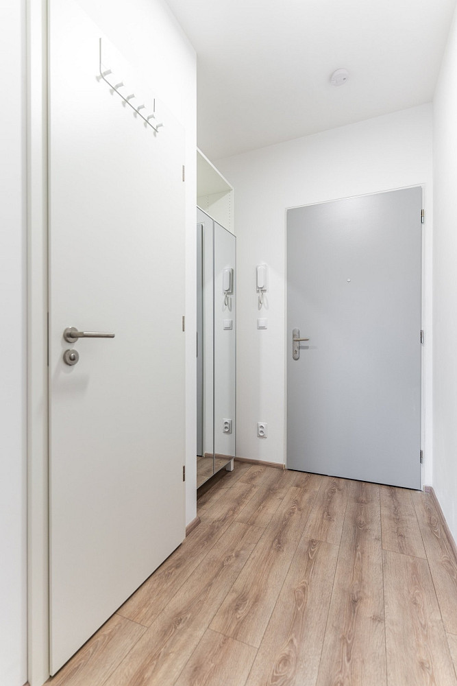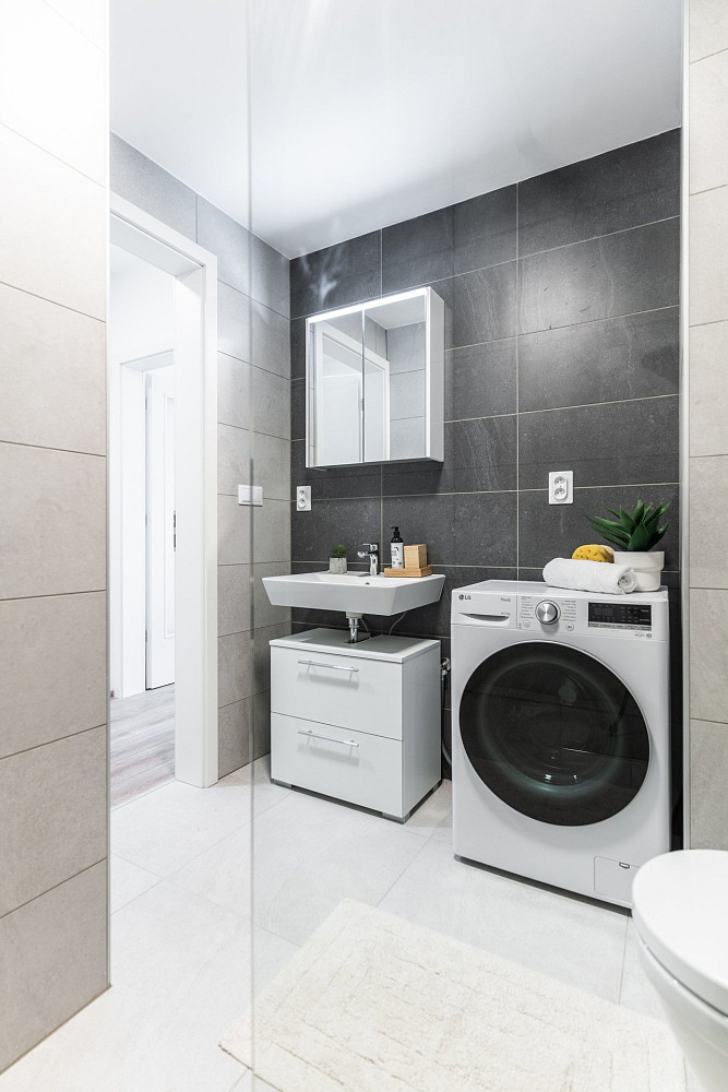 Abychom budoucím obyvatelům tohoto bytu ušetřili vynaložené úsilí při stěhování, vybavili jsme ho kuchyňskou linkou a pračkou se sušičkou. A nejedná se o nejlevnější kousky :) Nemalým bonusem je pak vybavení koupelny v podobě šuplat pod umyvadlem a zrcadlové skříňky, dále pak skříň v předsíni a zatemňovací závěsy.