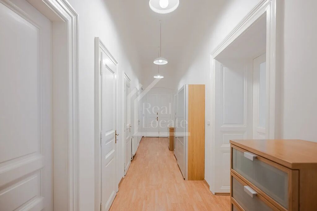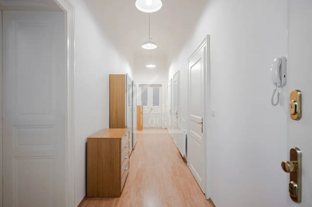 Středem bytu vede chodba, ze které je vstup do většiny místností. Všechny pokoje jsou velmi prostorné. Byt nabízí 3 oddělené ložnice, velkorysý obývací pokoj, plně vybavenou kuchyň z masivu, koupelnu s vanou a sprchovým koutem, samostatné WC a komoru.