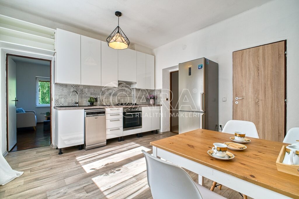 Přízemí (1. NP): útulná kuchyně, velká veranda, tradiční černá kuchyně s přímým vstupem na zahradu, dva pokoje, koupelna a WC.