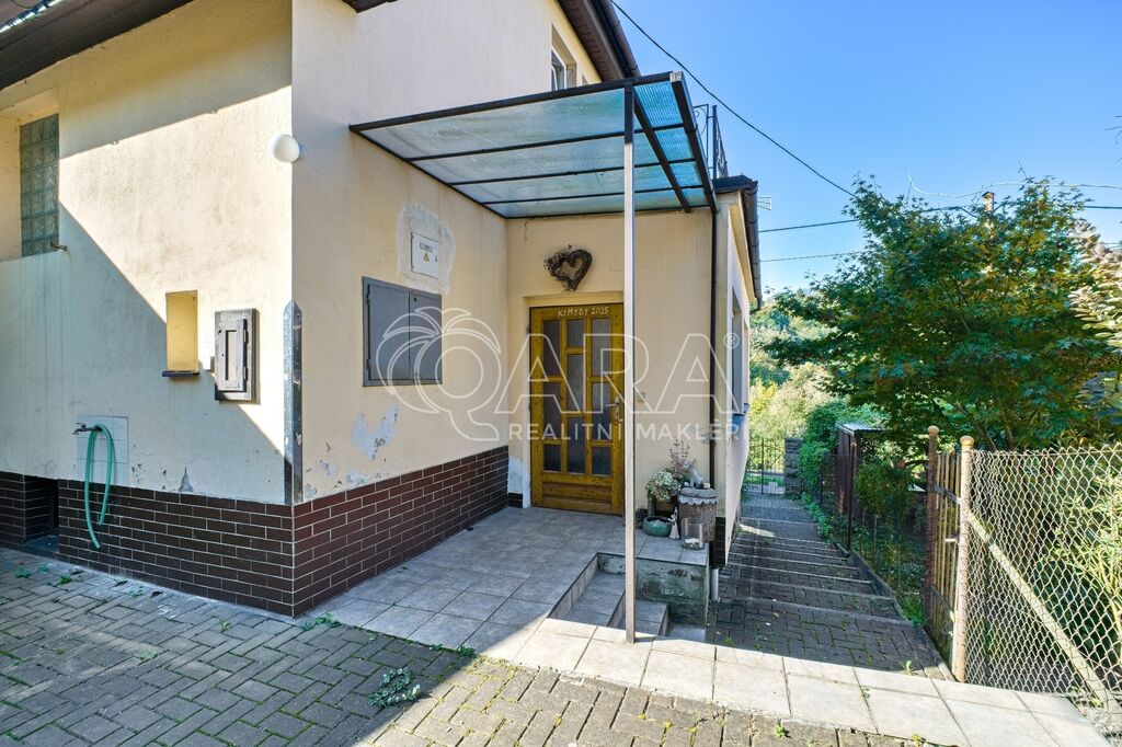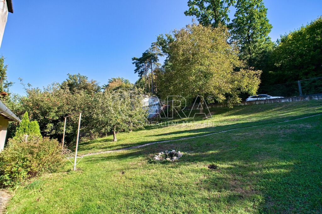 Za domem se nachází zahrada s ovocnými stromy, mírně ve svahu – ideální pro pěstování, ale i jako přírodní hřiště pro děti.