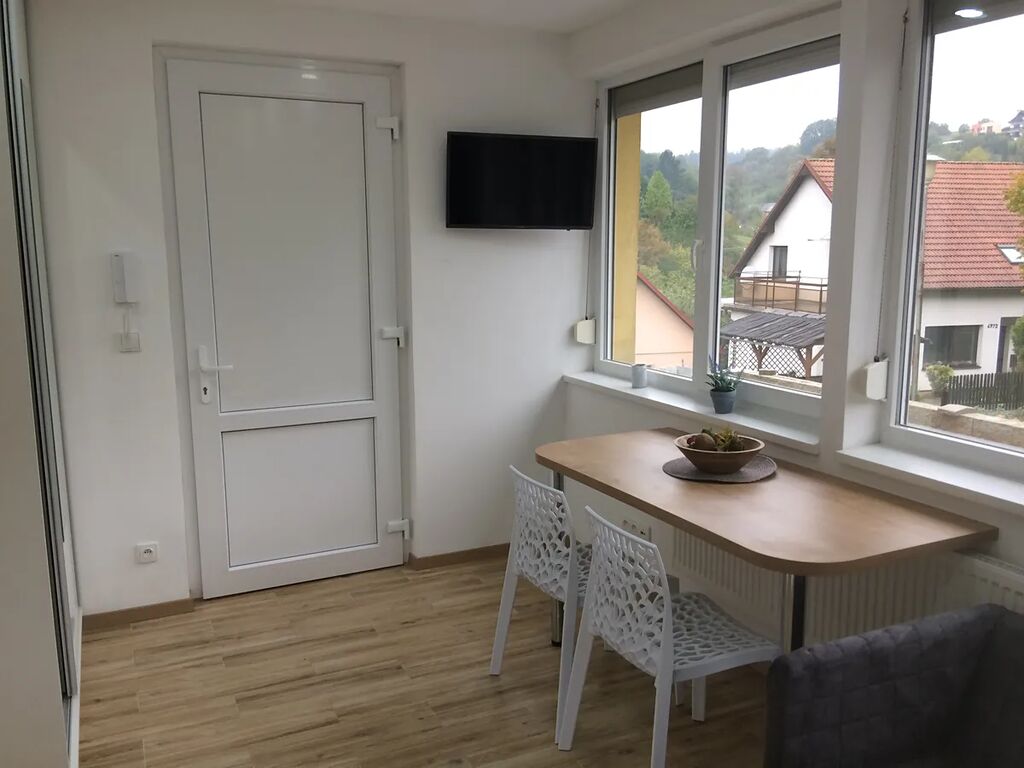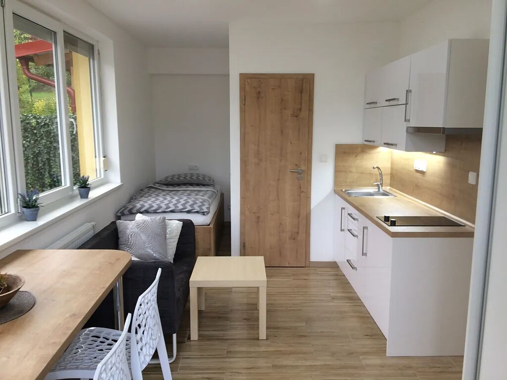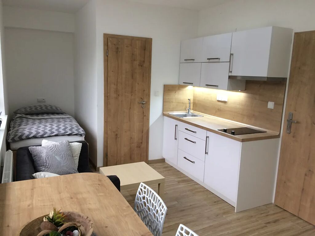 Dispozice a vybavení bytu: Kuchyňský kout se spotřebiči (lednice, varná deska, digestoř). Velkou výhodou je klimatizace. Dále je v pokoji vestavěná skříň, stůl, 2 židle, Samsung Smart TV, pohovka, konferenční stolek, postel s kvalitní matrací s polštářem, přikrývkou, plachtou a povlečením. Koupelna se sprchovým koutem a WC.