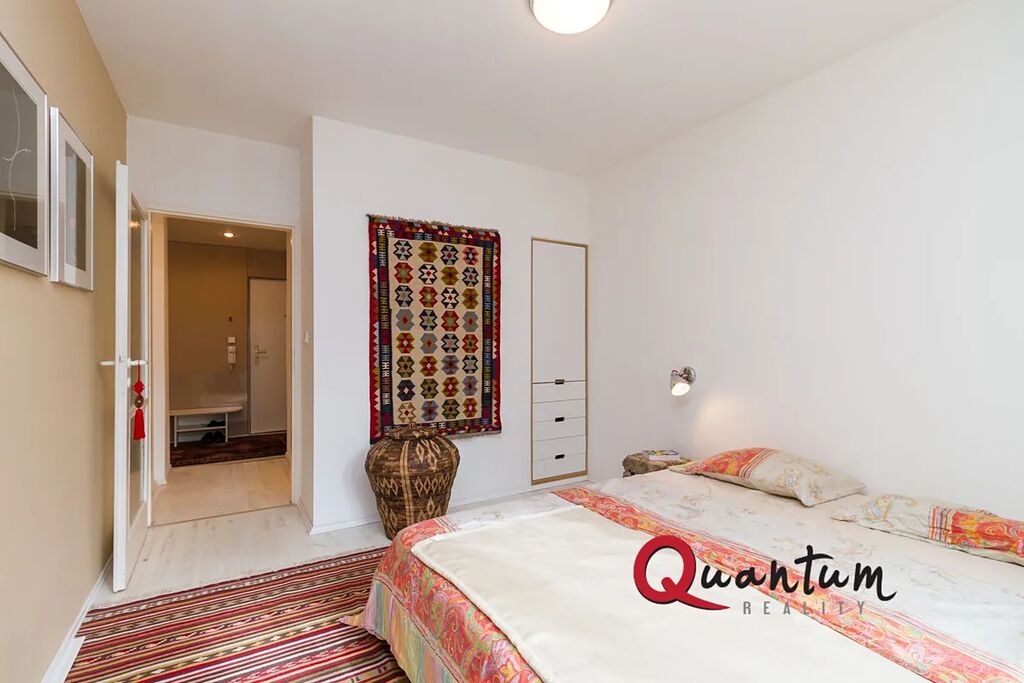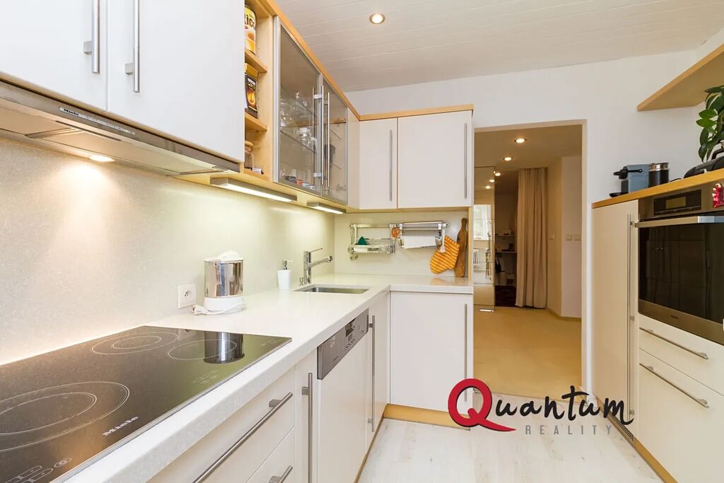 Vybavení: kuchyňská linka s vestavěnými spotřebiči (myčka, lednice, sklokeramická varná deska, elektrická a mikrovlnná trouba, pračka), dále postele (bez matrací), šatní skříně, sedačka, policové systémy, jídelní stůl se židlemi aj. Podlahy tvoří plovoucí podlaha, parkety, dlažba a koberec. K bytu náleží také sklep v suterénu domu.