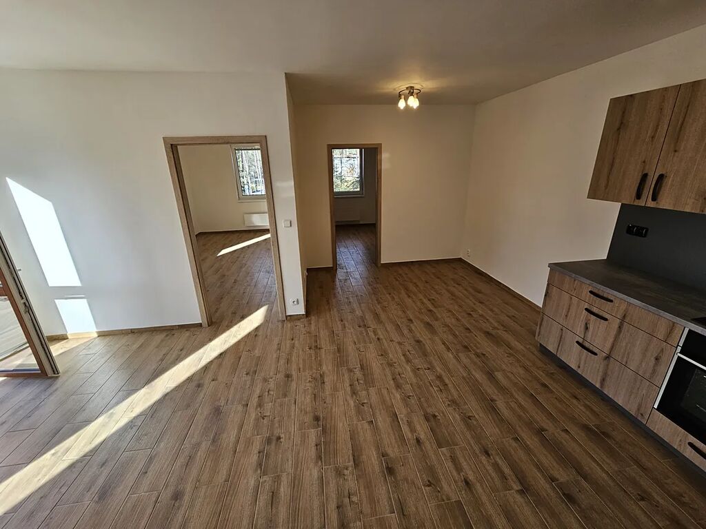 Koupelna s podlahovým vytápěním, se sprchovým koutem, závěsným WC, umyvadlovou skříňkou, a místem pro pračku. Obývací pokoj propojený s jídelnou a kuchyní se vstupem na rozměrný Balkón, a 2 ložnice.