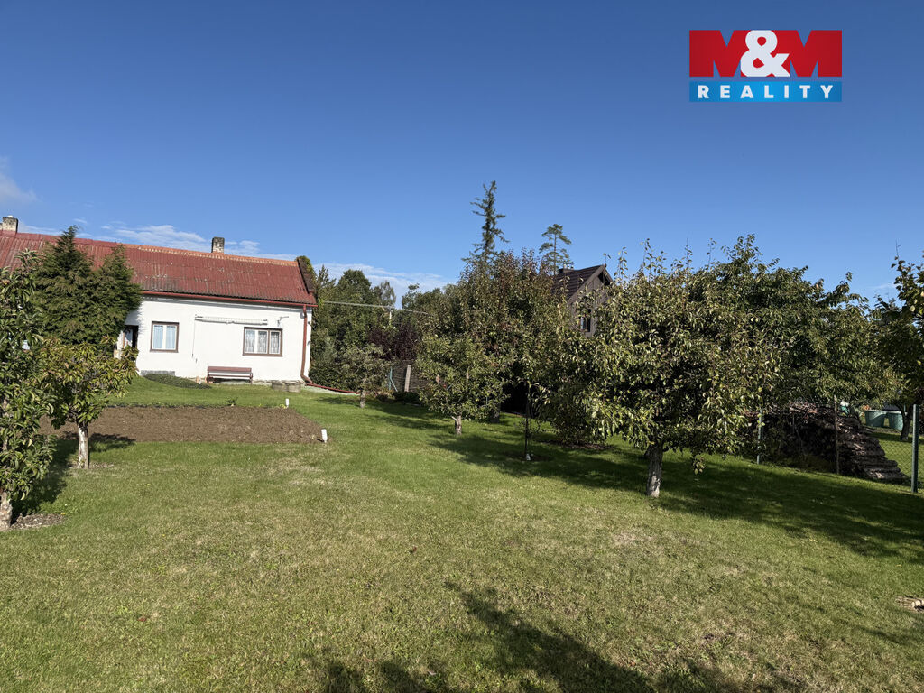 K chatě patří také dílna a krásná zahrada s ovocnými stromy, zeleninovými záhonky a místem pro odpočinek – ideální k posezení s rodinou, grilování i relaxu v přírodě.