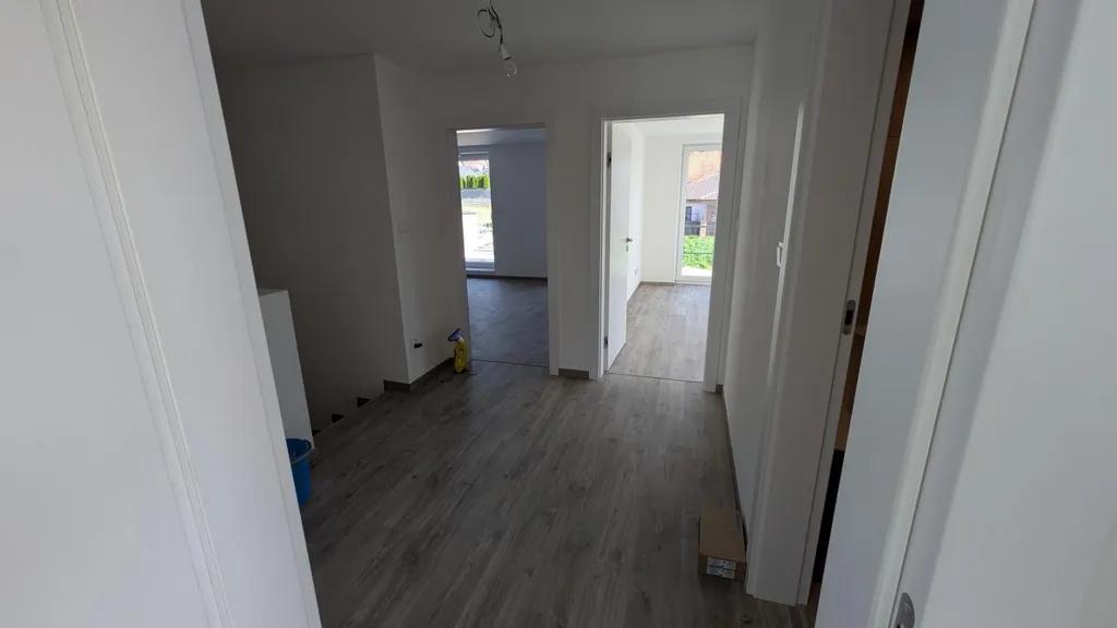Z obývacího pokoje je výstup na venkovní terasu o velikosti 20 m2 a dále do zahrady domu, kde byly položeny travní koberce po celé ploše zahrady. Zahrada je také připravena k okamžitému využívání. Dům je postavený z kvalitních a moderních materiálů včetně velkoformátových obkladů všech 3 koupelen. Příjezdová komunikace je veřejná komunikace ve vlastnictví města, v letošním roce proběhne její kompletní výstavba včetně finálních povrchů.