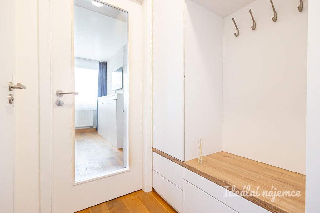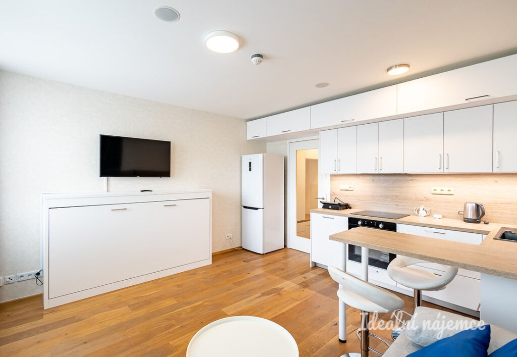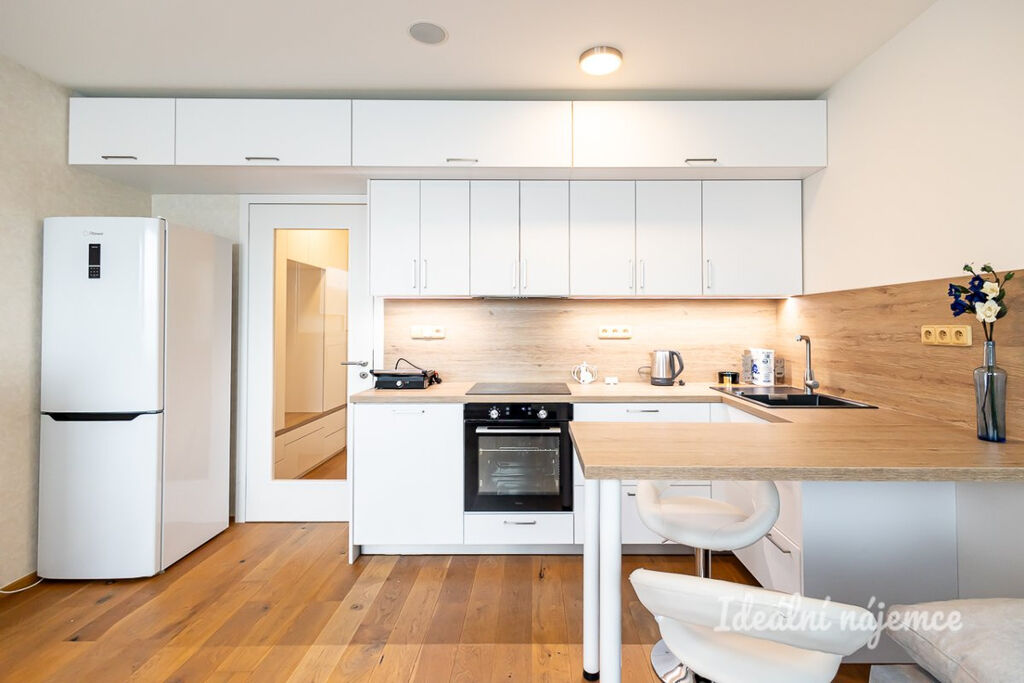 Byt se nabízí plně vybavený. Kuchyně disponuje lednicí s mrazákem, myčkou, elektrickou troubou, varnou deskou a digestoří. Obývací část je zařízena pohovkou, konferenčním stolem, barovým stolem s 2 židlemi, televizí a vyklápěcí postelí. V koupelně je sprchový kout, zrcadlo, umyvadlo a toaleta. V předsíni je vestavěná skříň, požární hlásič a intercom.