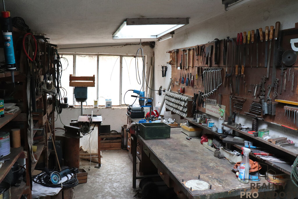 - garáž s dílnou (26 m²), kůlna na dřevo a zahradní domek,