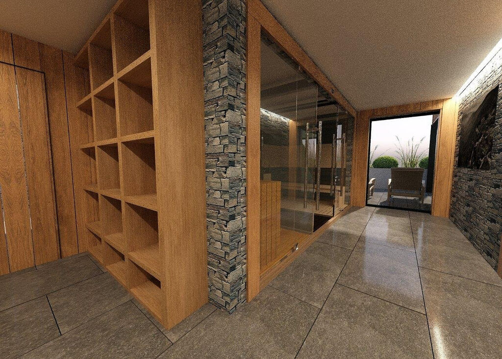 • 1. NP: lyžárna/šatna, kolárna, sklad prádla, technické zázemí, kinosál/VR herna, wellness se saunou