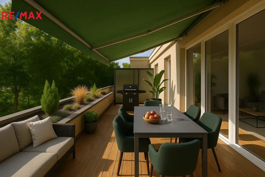 Byt o dispozici 4+1, 95 m² v ulici Pod Skalkou kombinuje výhledy do zeleně s velkou terasou 20 m² orientovanou na jih a vynikající dopravní dostupností.