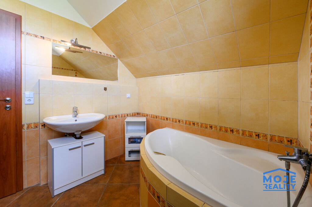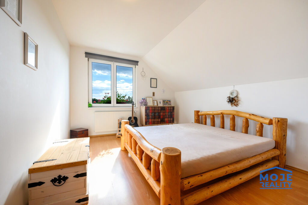Podkroví: ložnice, dva dětské pokoje, koupelna s vanou a samostatné WC. Dřevěné schodiště dodává prostoru útulný charakter.