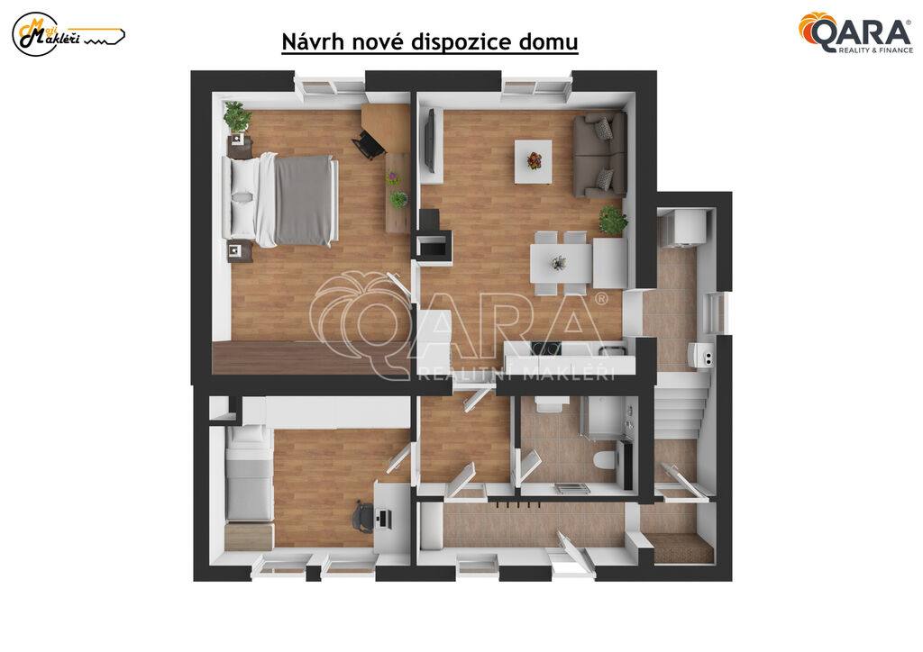 Samotný dům má v současnosti dispozici 2+1 a zastavěnou plochu 88 m². Dispozici lze jednoduše upravit na 3kk (návrh od projektanta ve foto prezentaci), v případě rozšíření do podkroví pak až na dispozici 5kk. Z inženýrských sítí je k dispozici, elektřina a kanalizace, plyn je na hranici pozemku, stejně tak vodovod (aktuálně se v Hostomicích dokončuje projekt na zvýšení kapacity vodovodu, k připojení by mělo dojít přibližně na jaře roku 2026).