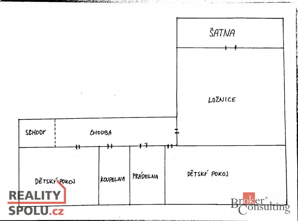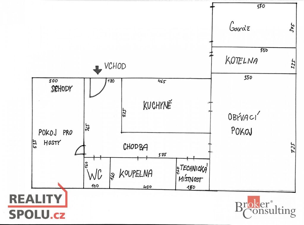 Dům je přízemní s obytným podkrovím do tvaru L a dispozičně nabízí:
