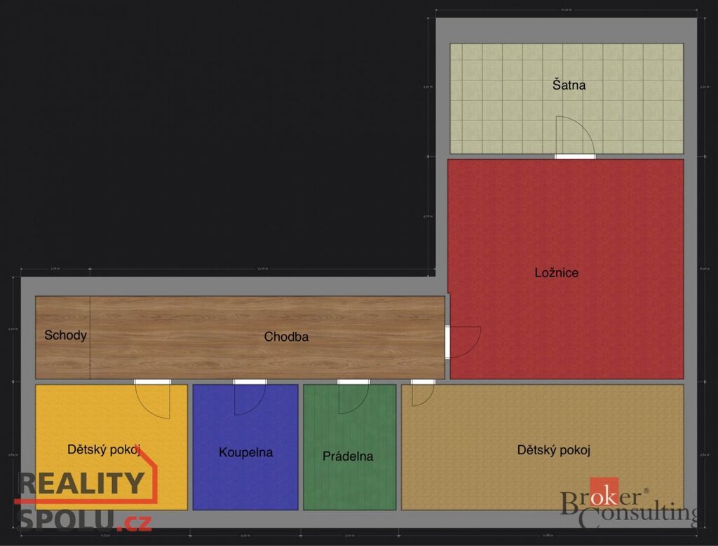 tři ložnice, velká šatna a koupelna se sprchou a toaletou, prádelna.