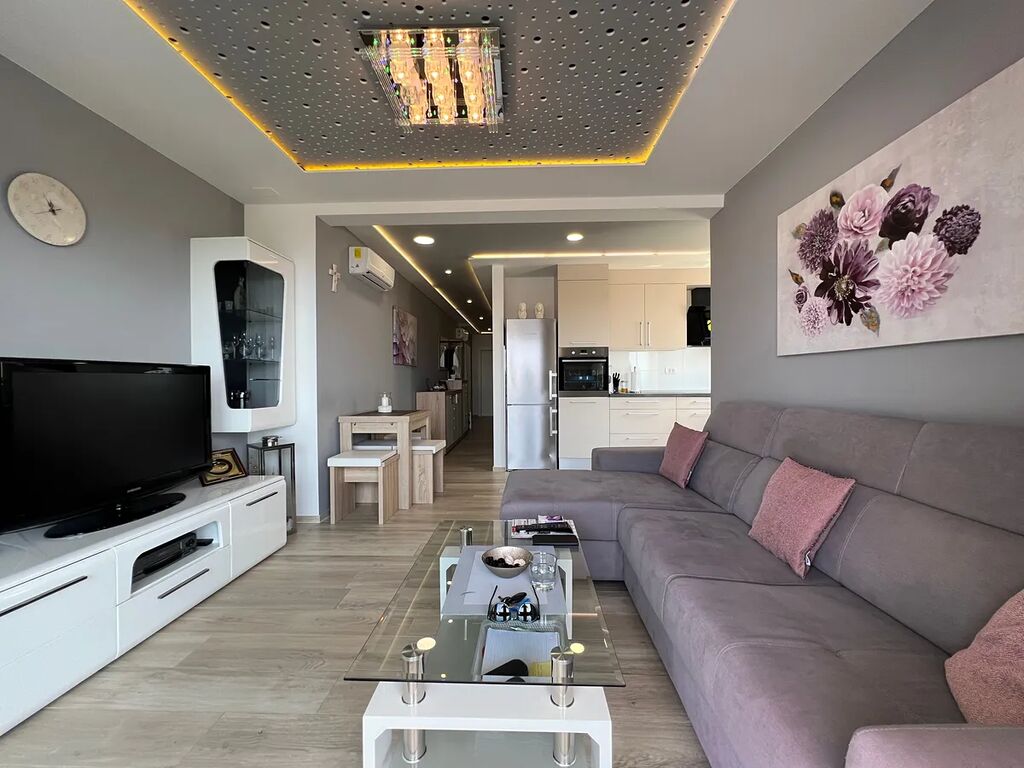 Apartmán o ploše 76,85 m2 sestává z chodby, tří ložnic, koupelny, toalety, balkonu o rozloze 6,20 m2, obývacího pokoje s kuchyní a jídelním koutem s přístupem na prostornou jižně orientovanou lodžii o rozloze 15,30 2 s částečným výhledem na moře. Apartmán je velmi málo využívaný, je kompletně zařízený novým nábytkem a jsou zde i 2 klimatizační jednotky. K apartmánu náleží jedno parkovací místo a garážové stání o rozloze 12 m2 v suterénu budovy.