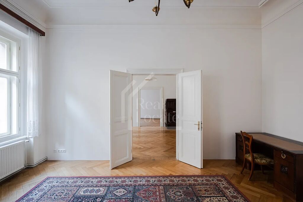 Atraktivitu bytu zdůrazňují vysoké stropy přes 4 m a krásná repasovaná velká okna. Byt je částečné zařízený (vestavěné skříně, nábytek ..). Částečná rekonstrukce proběhla před pár lety (nový plynový kotel, kuchyň, broušení parket). Dispozice je ideální pro rodinné bydlení.