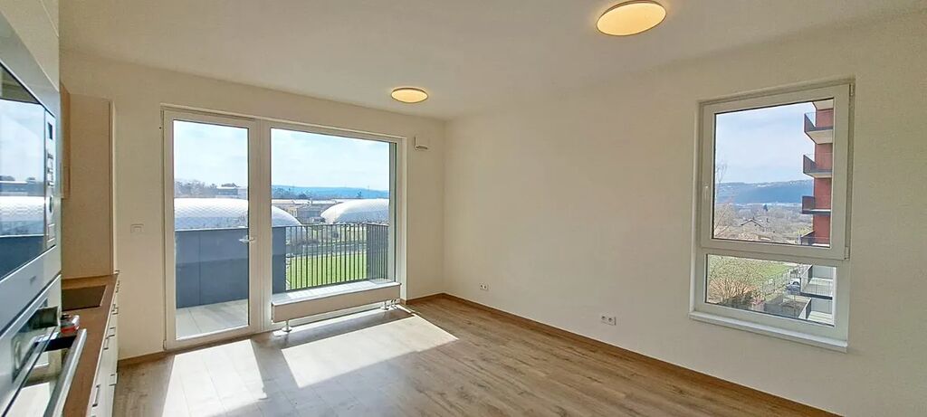 Hezký slunný byt (B242) s výhledem na sportoviště a okolní rezidenční zástavbu. Při vstupu do bytu se nachází velká předsíň s šatní skříní, z ní je pak vstup do koupelny s WC. Obývací pokoj je vybaven kuchyňskou linkou (Gorenje) vč. spotřebičů, z obývacího / pokoje vstup na velký balkon.