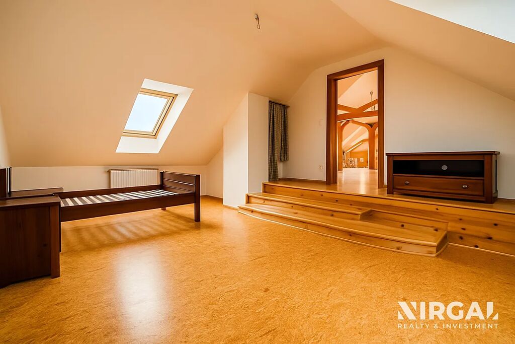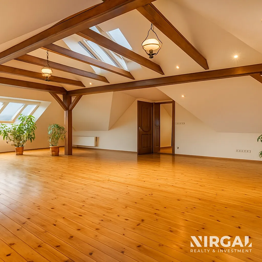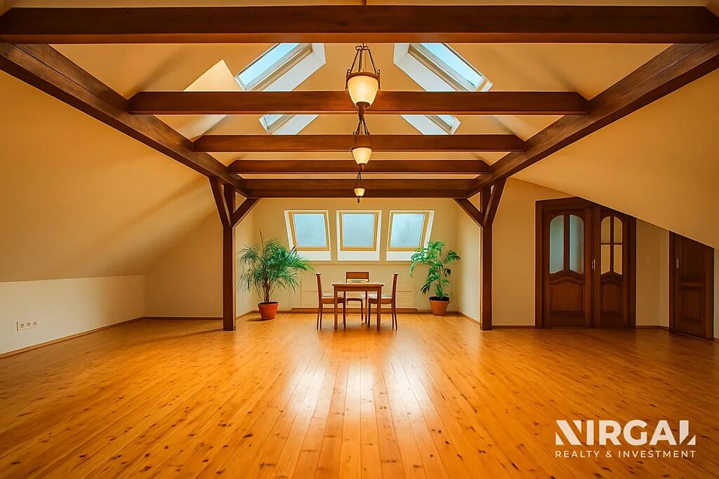 Celý byt zdobí elegantní dřevěné podlahy, přiznané stropní trámy a kvalitní materiály, které podtrhují nadčasový styl interiéru. Díky mezonetovému uspořádání působí byt vzdušně a otevřeně, množství oken a střešních světlíků přináší přirozené světlo během celého dne.