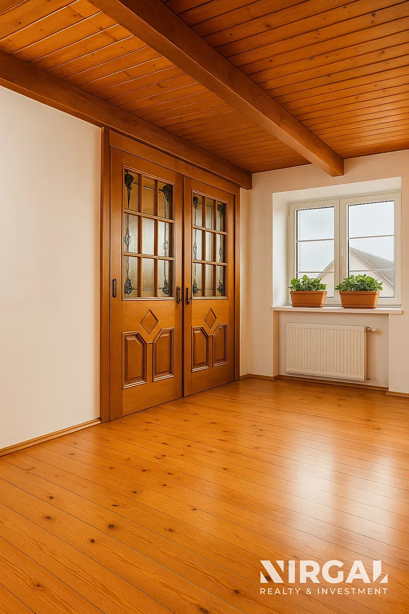 Interiér bytu tvoří velkoryse řešený obývací pokoj s jídelní částí, samostatná plně vybavená kuchyně, hlavní ložnice s vlastní en-suite koupelnou, druhá ložnice (12 m²) a prostorná vstupní hala. Obě ložnice zdobí elegantní dřevěné podlahy, které dodávají interiéru klasický charakter rodinné vily.
