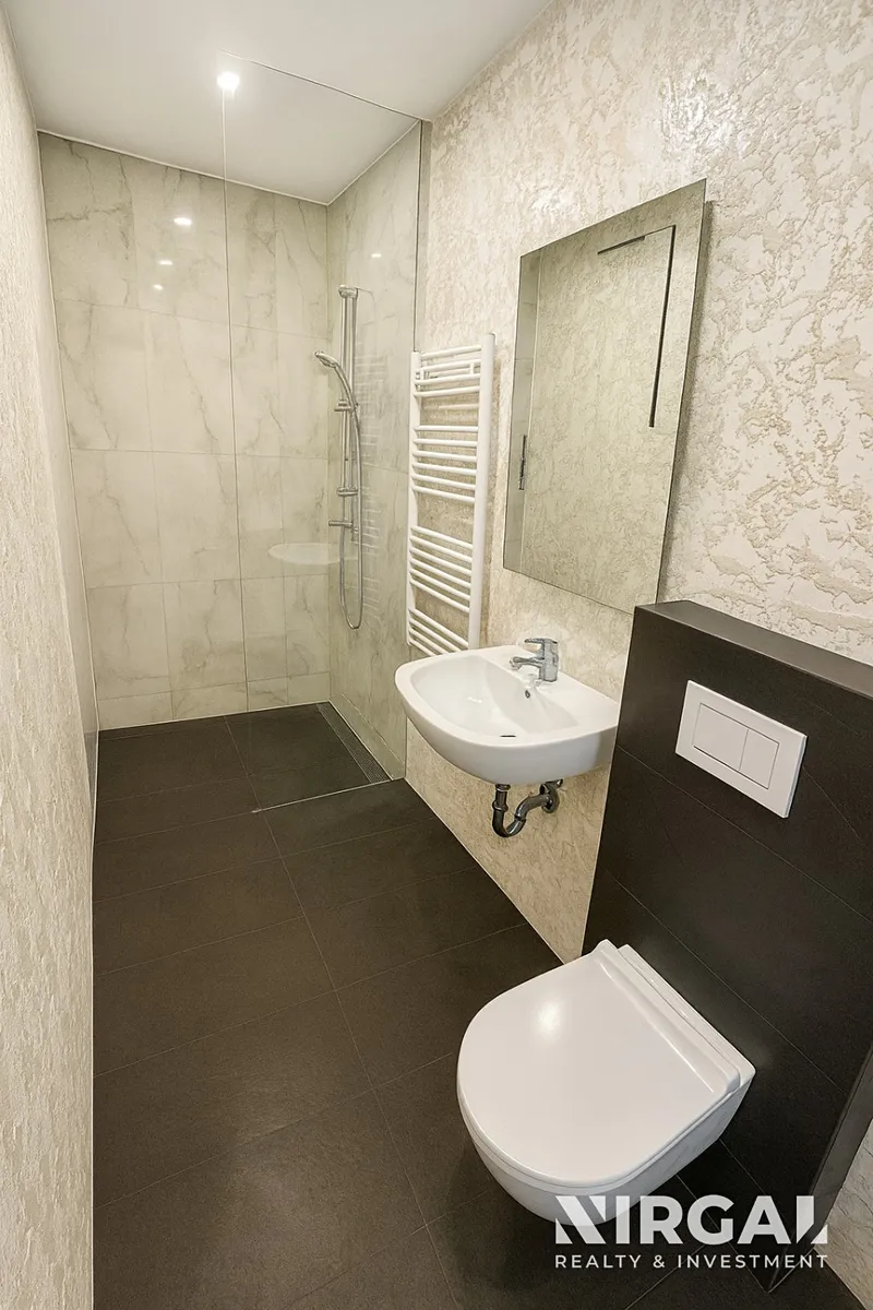Interiér velmi prostorného obývacího pokoje, laděný ve světlých tónech, působí elegantně a vzdušně a nabízí harmonický prostor s dostatkem denního světla. Otevřená kuchyň je propojena s obývacím pokojem a ložnicí orientovanou do klidné ulice, což zajišťuje maximální soukromí. Oba pokoje jsou vybaveny elegantní parketovou podlahou, která interiéru dodává noblesní charakter. Byt je částečně vybavený – součástí je nová kuchyňská linka se spotřebiči (trouba, digestoř, varná deska, myčka, lednice). V koupelně se nachází sprchový kout, toaleta, podlahové vytápění a moderní žebříkový radiátor. Součástí vybavení je také pračka.