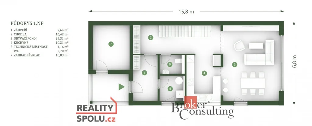 • Obývací pokoj (19,66 m²) – s velkoformátovým HS portálem vedoucím přímo na zahradu