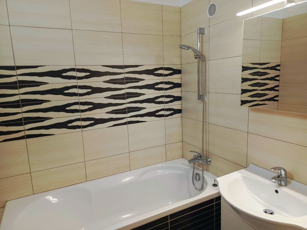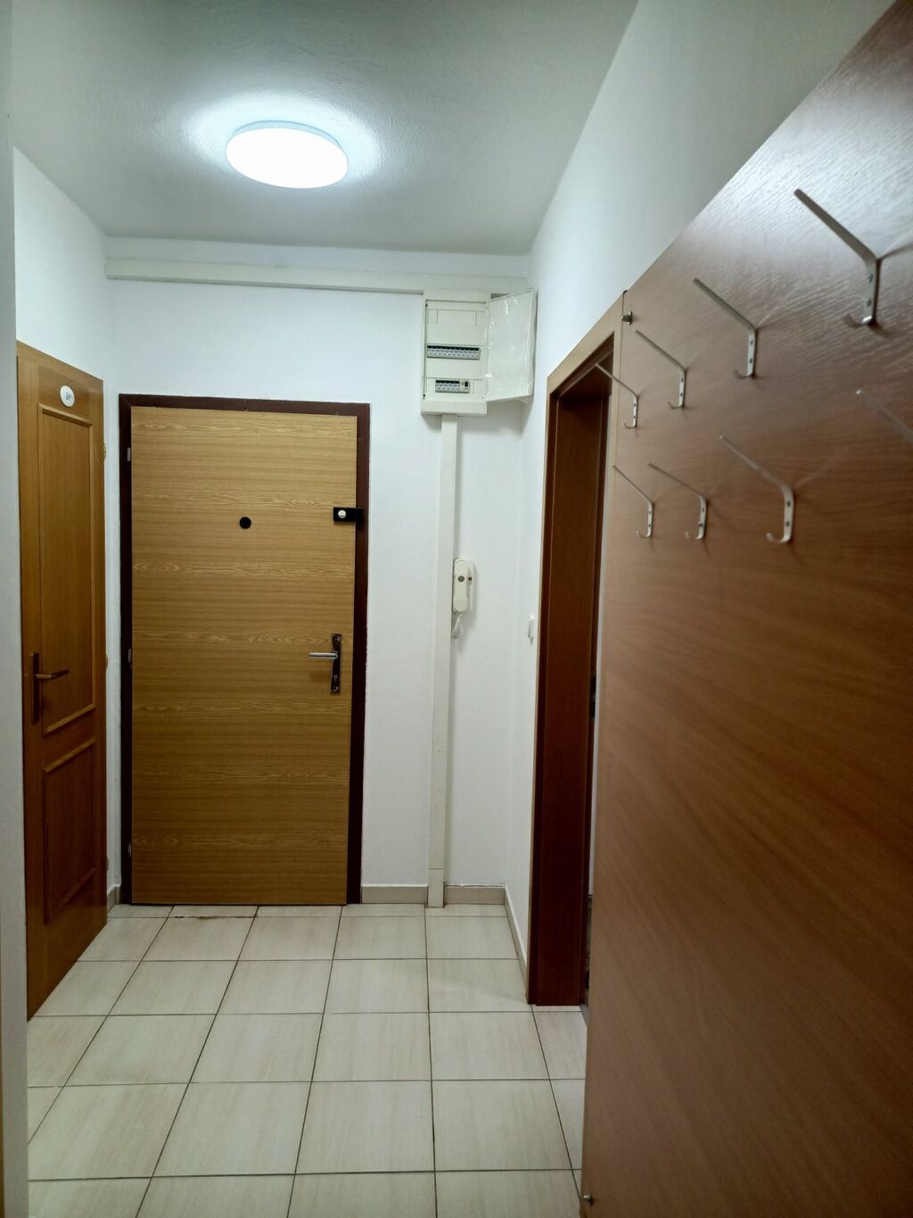 Dispozice bytu: vstupní předsíň, hala, odkud je vstup na toaletu s umyvadlem a WC sprškou, dále do koupelny (vana, umyvadlová skříňka, zrcadlová skříňka s osvětlením, místo na pračku), dále do kuchyně a obývacího pokoje. V kuchyni jsou nové vestavěné spotřebiče - varná indukční deska, el. trouba, myčka a digestoř. Z kuchyně je vstup do obýváku a následně do dalších pokojů, které jsou průchozí. Z obýváku je vchod na balkon orientovaný na západ.