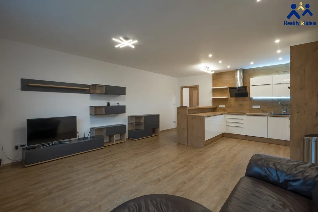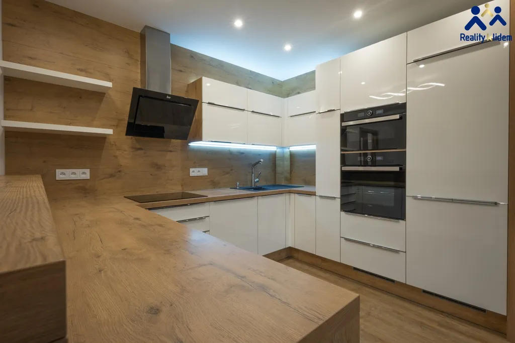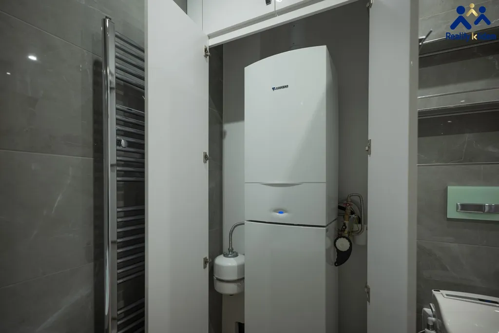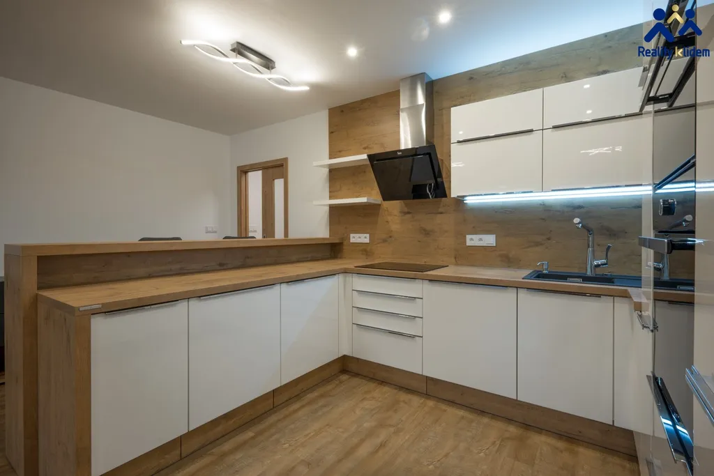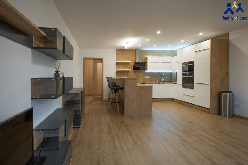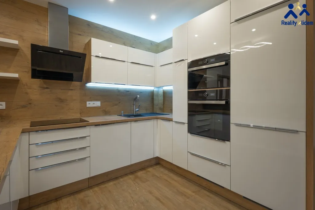 Součástí obývacího pokoje je krásná, na míru zhotovená, kuchyňská linka s vestavnými spotřebiči. Myčka na nádobí, trouba, mikrovlnná trouba, indukční deska a lednička s mrazákem jsou vkusně zakomponovány do interiéru. Byt je vytápěn deskovými radiátory, v koupelně se nachází topný žebřík.