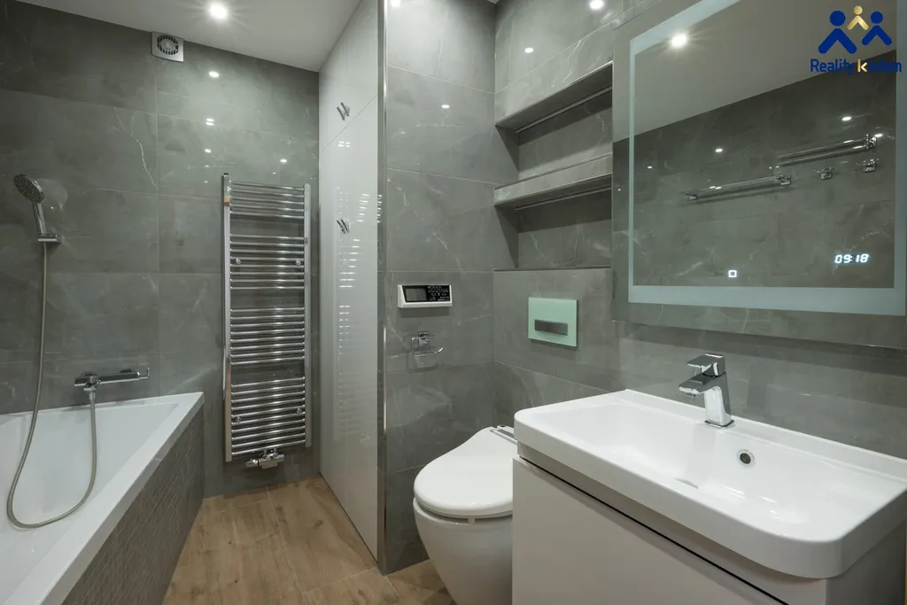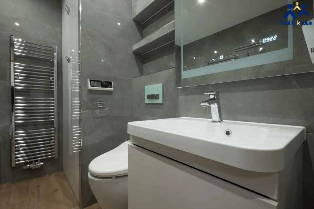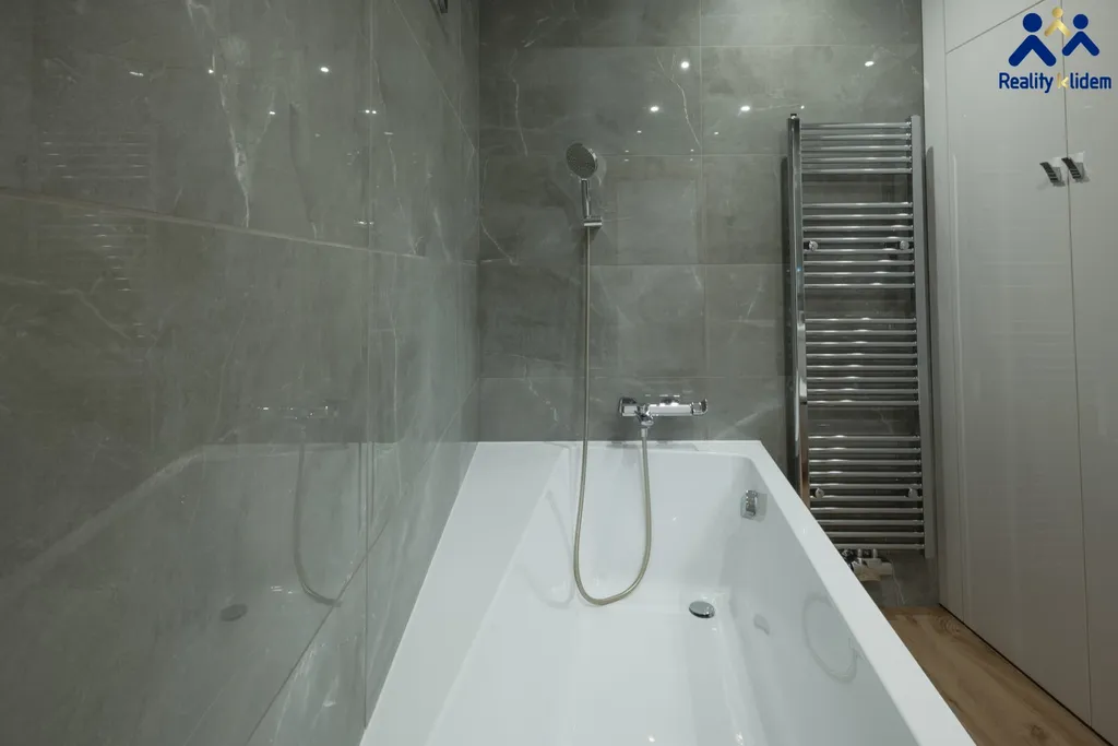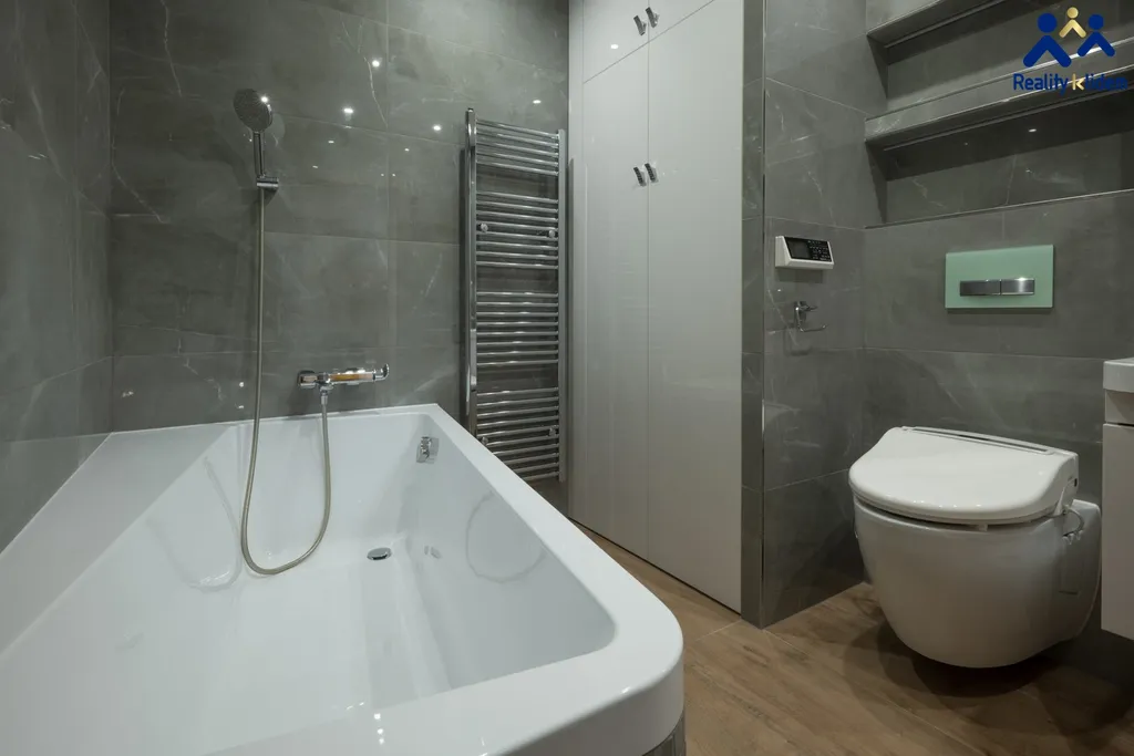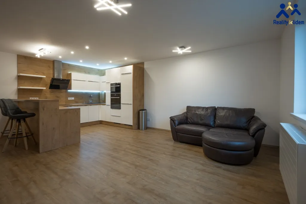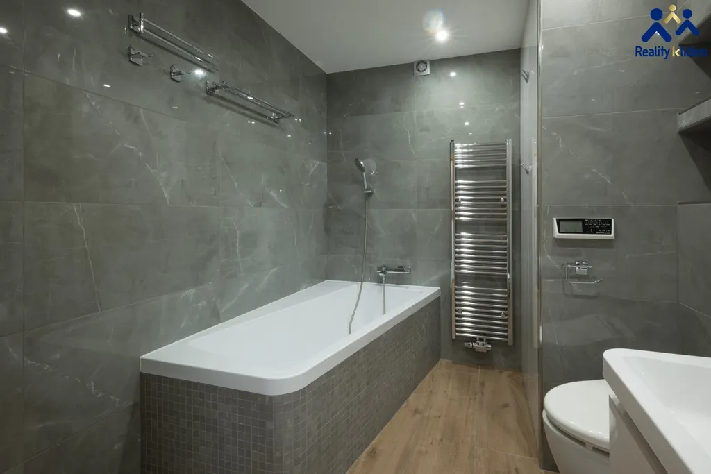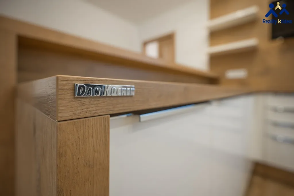 Součástí obývacího pokoje je krásná, na míru zhotovená, kuchyňská linka s vestavnými spotřebiči. Myčka na nádobí, trouba, mikrovlnná trouba, indukční deska a lednička s mrazákem jsou vkusně zakomponovány do interiéru. Byt je vytápěn deskovými radiátory, v koupelně se nachází topný žebřík.