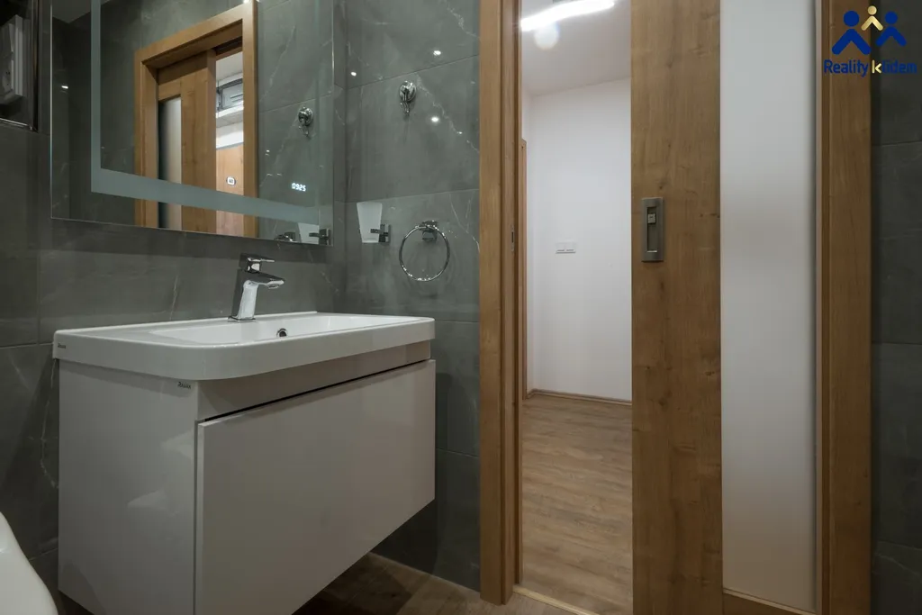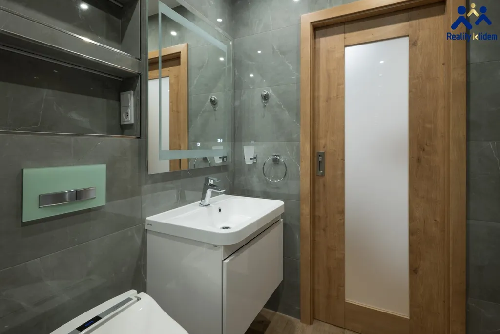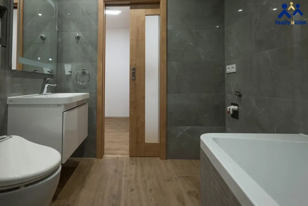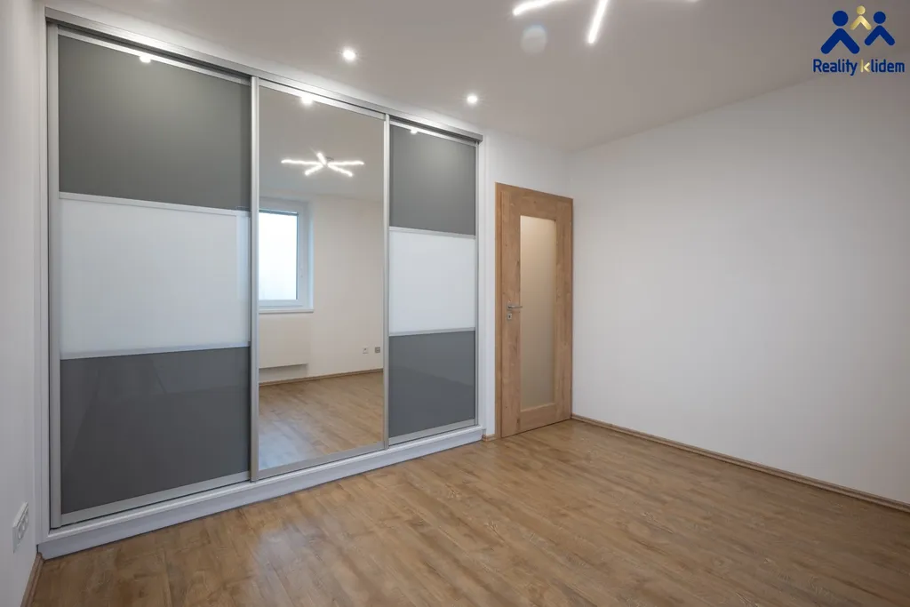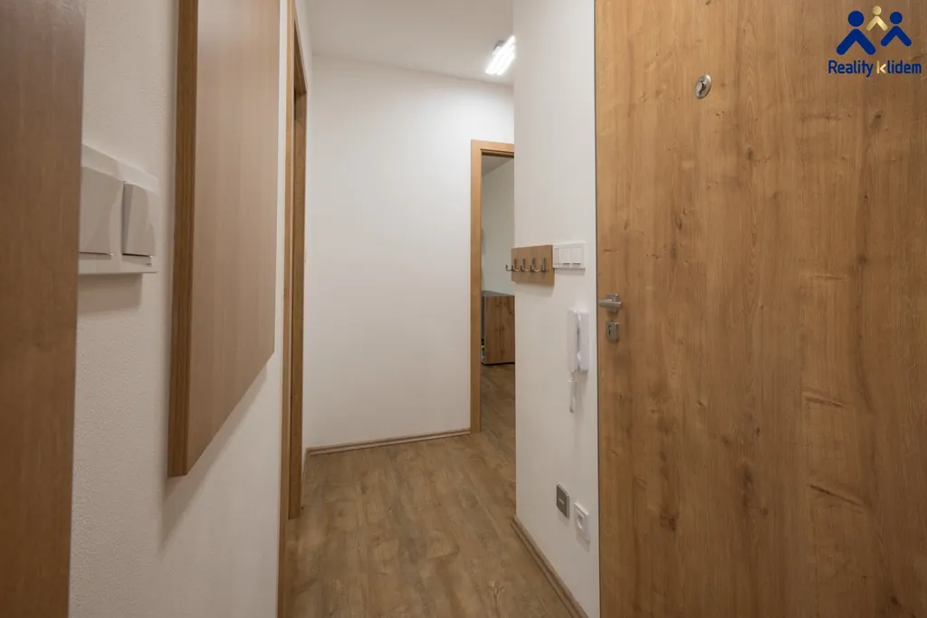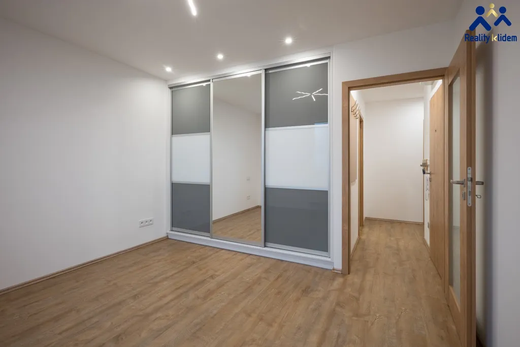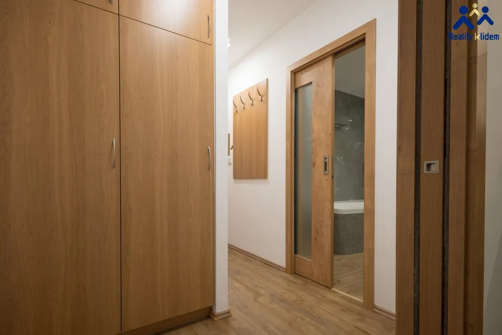 Byt je zařízený s vynilovými podlahami, moderní koupelnou a vestavnou skříní v ložnici a na chodbě.