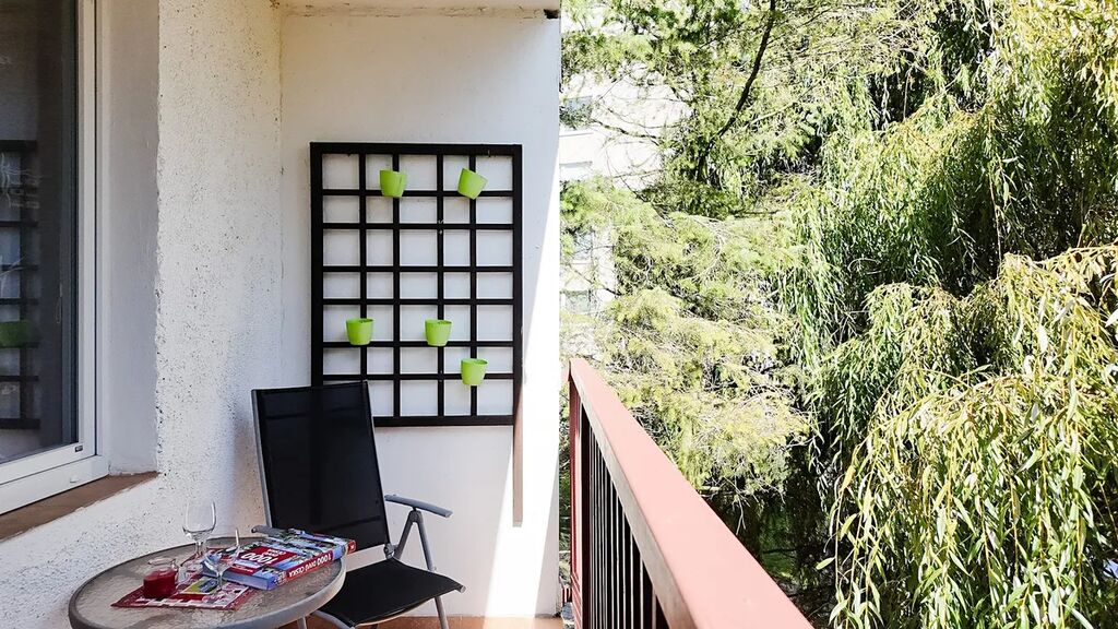 Lodžie je skvělým místem pro relaxaci s výhledem do okolní zeleně, ideální pro posezení s šálkem kávy nebo čtení.