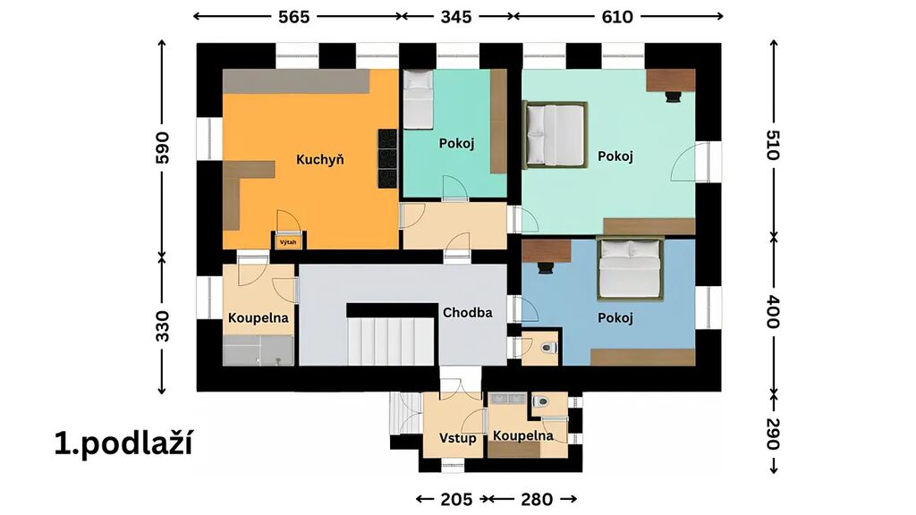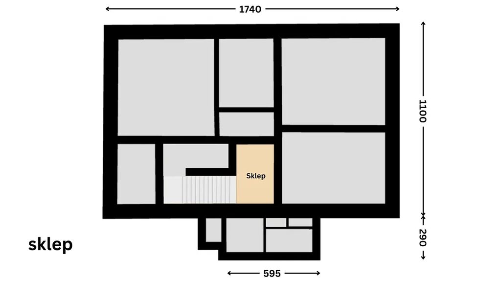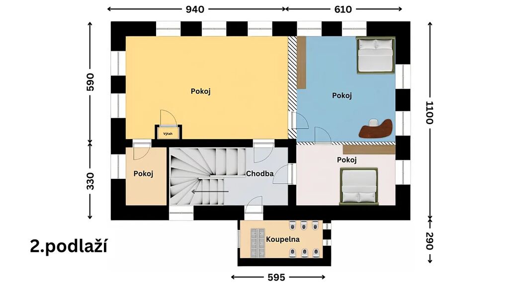 Budova je částečně podsklepená. Celková užitná plocha obou nadzemních podlaží je cca 290 m2.