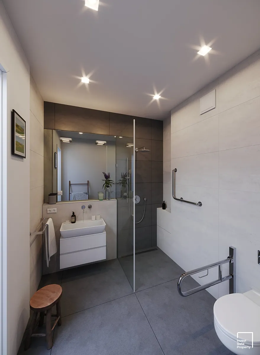 Byt o dispozičním řešení 1+1, v prvním podlaží resortu, nabízí velkoryse pojatý obývací pokoj se vstupem na balkon a kuchyňským koutem, vstupní halu s prostorem pro úložné systémy a nadstandardně vybavenou koupelnu s toaletou. Všechny byty jsou vybaveny zařizovacími předměty vysokého standardu s možností volby z několika barevných dekorů.