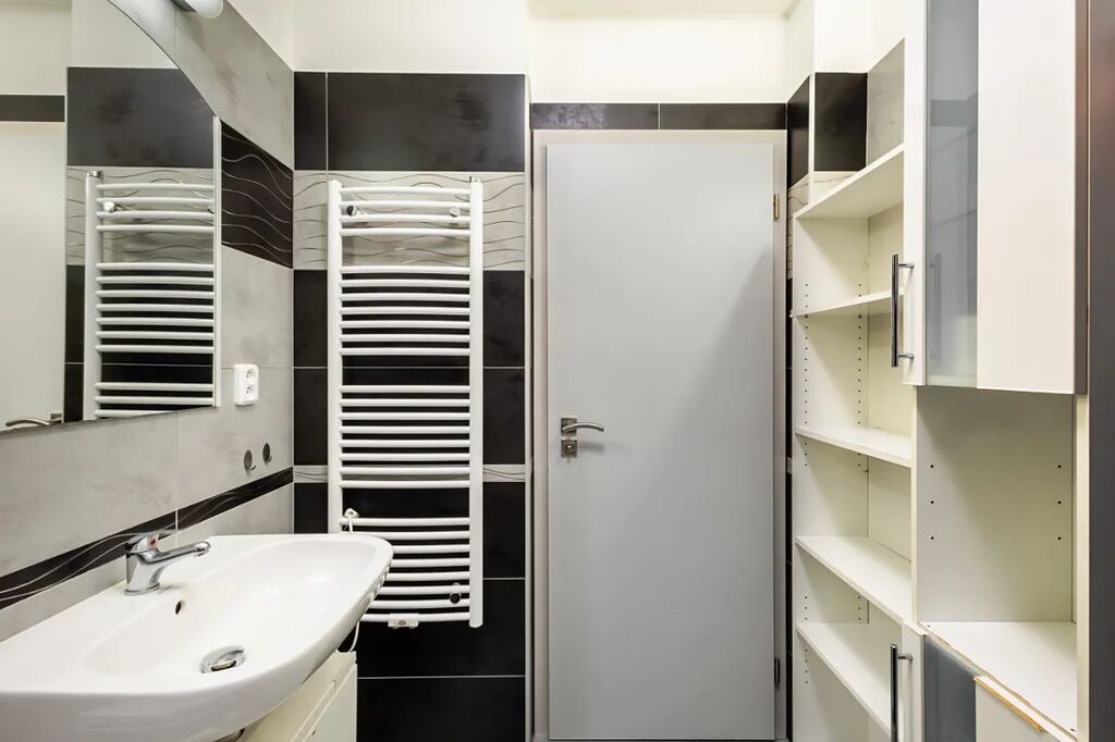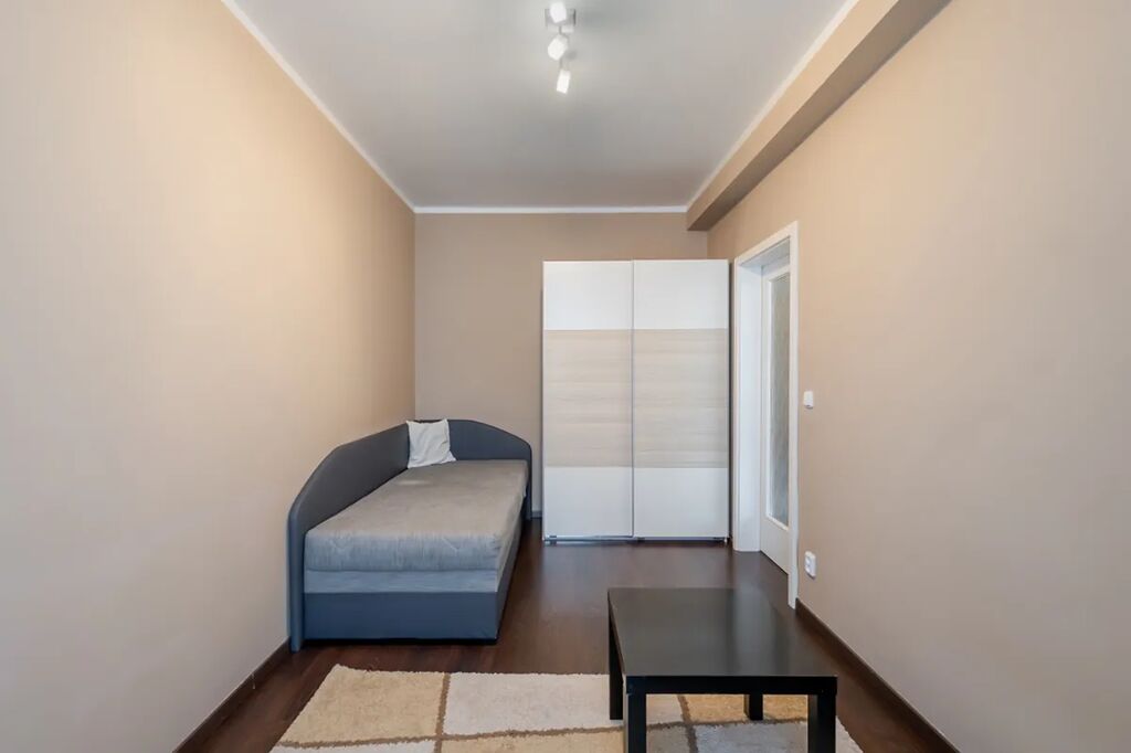 V bytě je velká předsíň s věšákovou stěnou a pračkou, koupelna s rohovou vanou a umyvadlem (otopný žebřík, skříňka, zrcadlo, ventilátor, místo pro pračku), samostatné WC s bidetovou sprchou a umyvadlem, útulná ložnice s vestavěnou skříní, pěkný obývací pokoj s jídelním koutem a moderní kuchyňskou linkou na míru. Kuchyň je plně vybavena elektrickými spotřebiči - el. trouba, myčka, sklokeramická varná deska, digestoř, vestavěná lednice s mrazákem, MW, kávovar, dřez). V pokoji stůl + 2 židle, skříňka. Z obývacího pokoje je vstup na balkon (stůl +2 židle, úložný box).