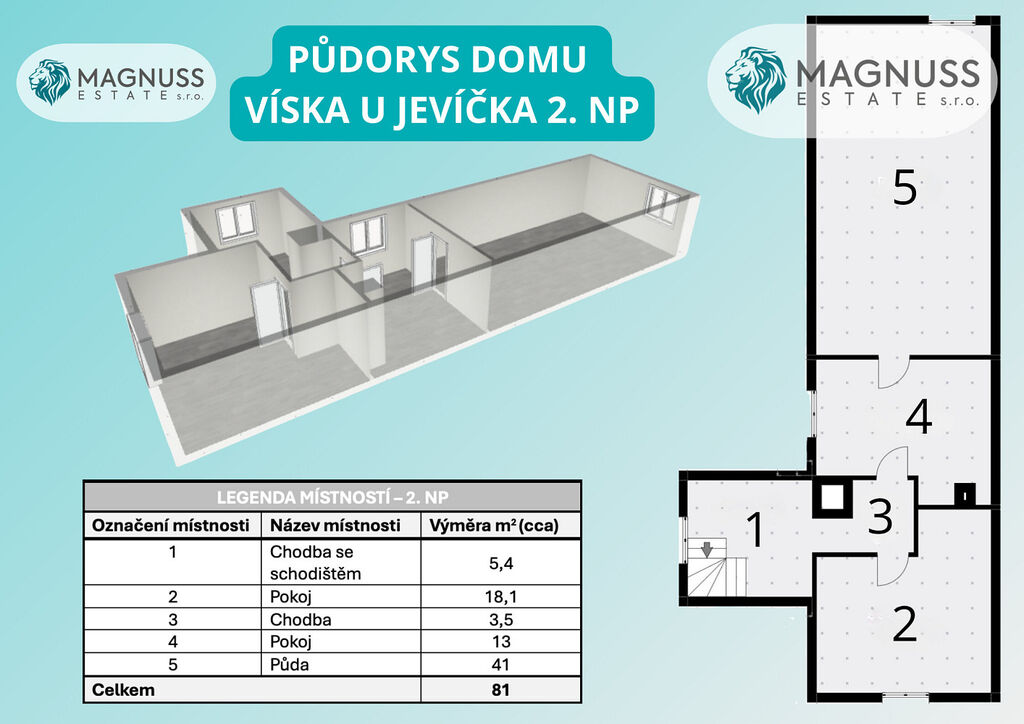 - Patro: Dvě samostatné ložnice, chodba a přístup do půdních prostor s možností dalšího rozšíření.