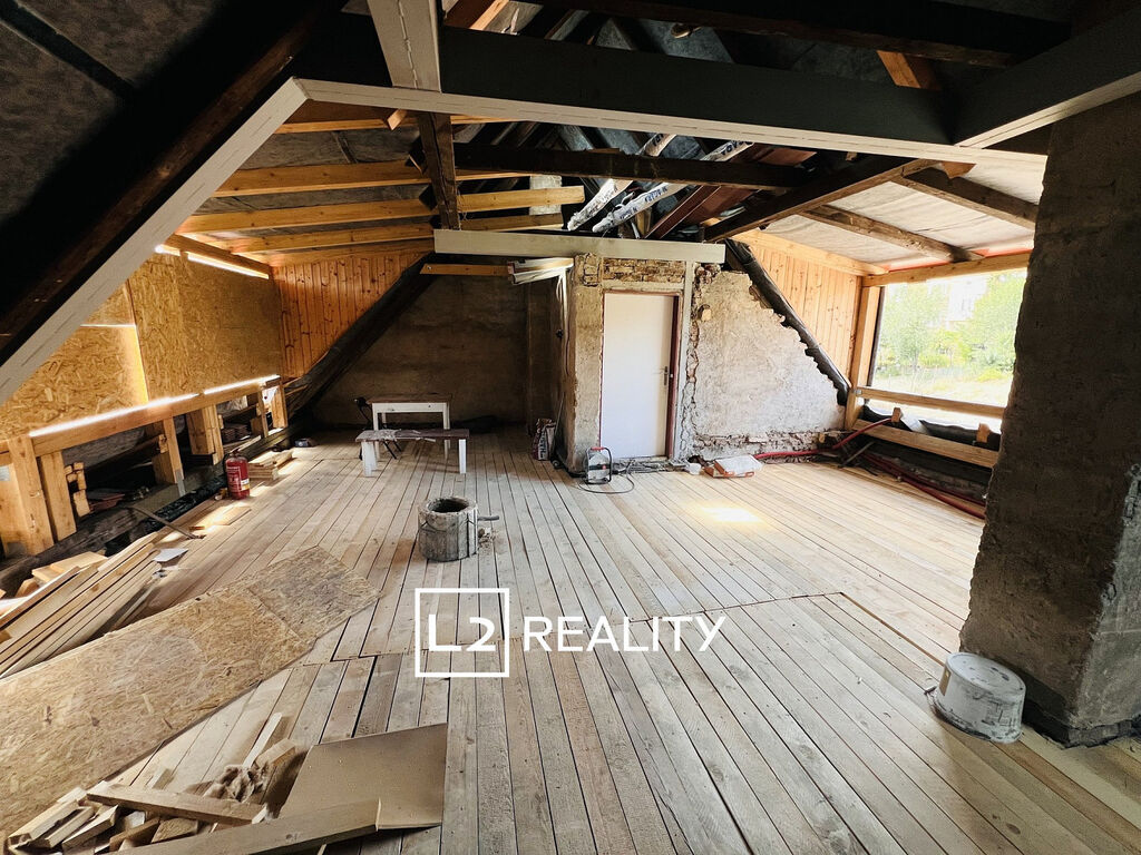 Exkluzivně nabízíme v předprodeji půdní prostor, v současnosti vedený jako "jiný nebytový prostor", čekáme na stavební úřad pro přepis na byt. Prostor je v současné době úplně otevřený a je možno dispozici libovolně upravit. V náhledu je náš návrh vnitřního prostoru na 3+kk. Všechny velké stavební úpravy půdy jsou již hotové - nová střecha, izolace pod novým záklopem podlahy, vývod plynu, elektřiny, vody a odpadu jsou připraveny.