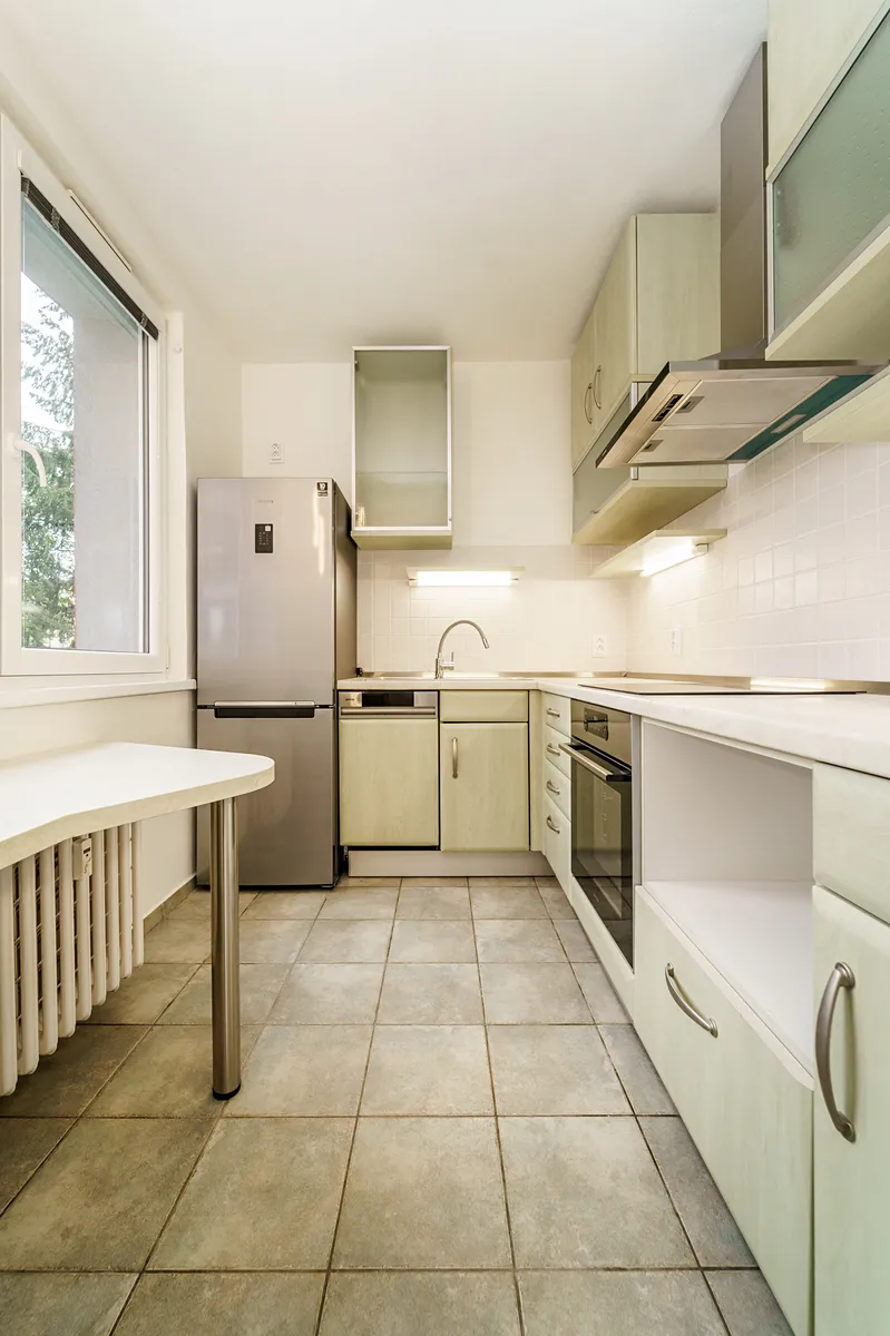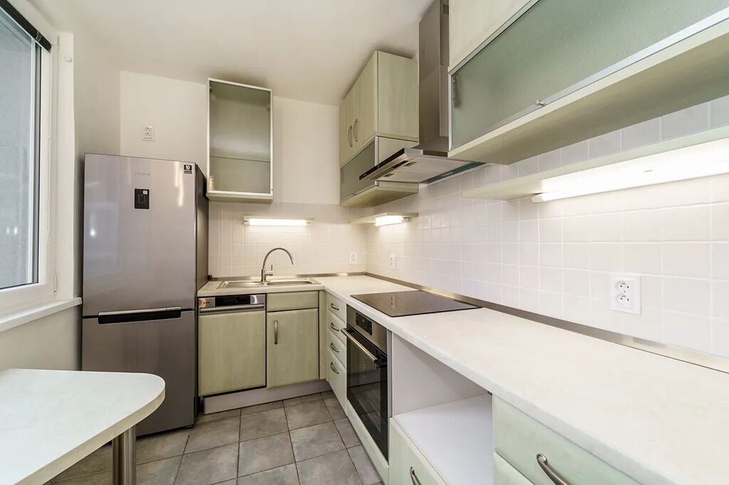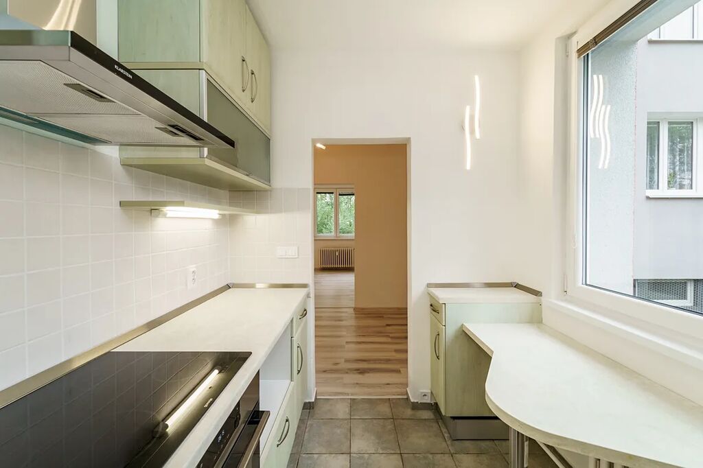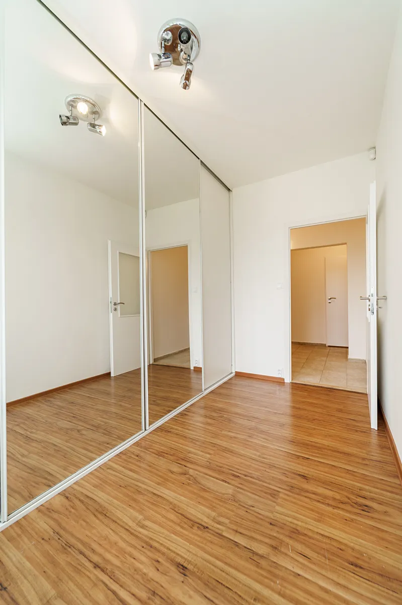 Kuchyně s dostatkem úložného prostoru sousedí s jídelnou plynule přecházející v prostorný obývací pokoj s příjemným výhledem do městské zeleně. Vedle obývacího pokoje je umístěn samostatný pokoj vhodný jako ložnice s prosklenou lodžií a chodba s přístupem do dalších dvou oddělených místností s výhledem na bazén. Větší místnost je možno použít jako druhou ložnici nebo dětský pokoj. Nejmenší místnost se zabudovanou velkou vestavěnou skříní je možno využít jako pracovnu a šatnu nebo pokoj pro hosty. Z chodby je také přístupná větší koupelna s WC v jedné místnosti.