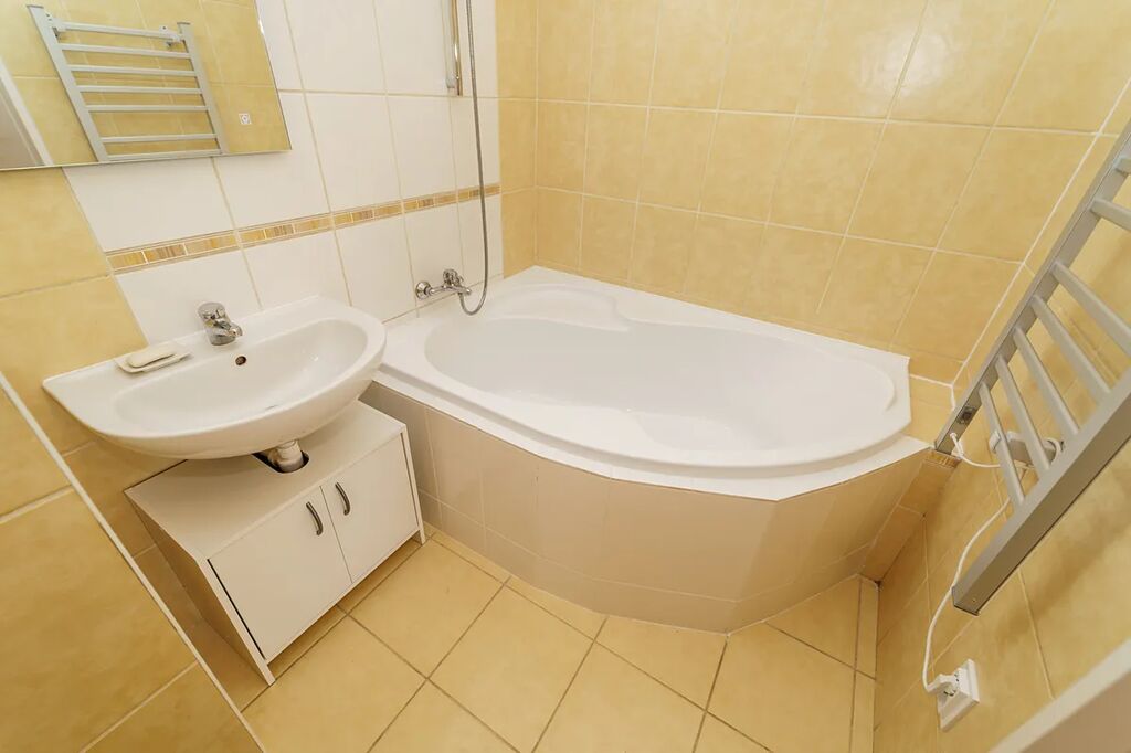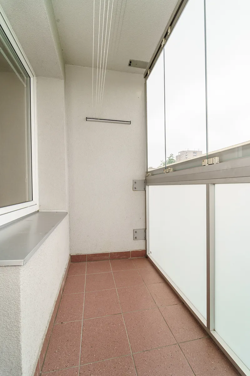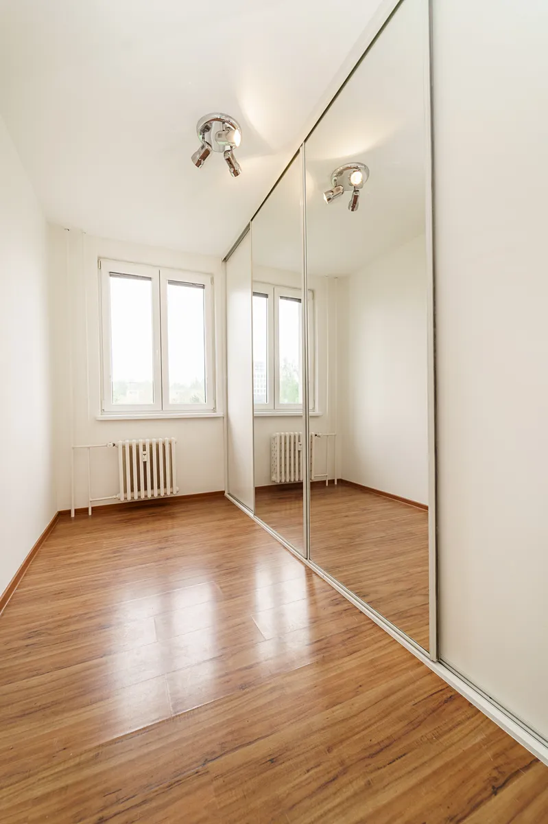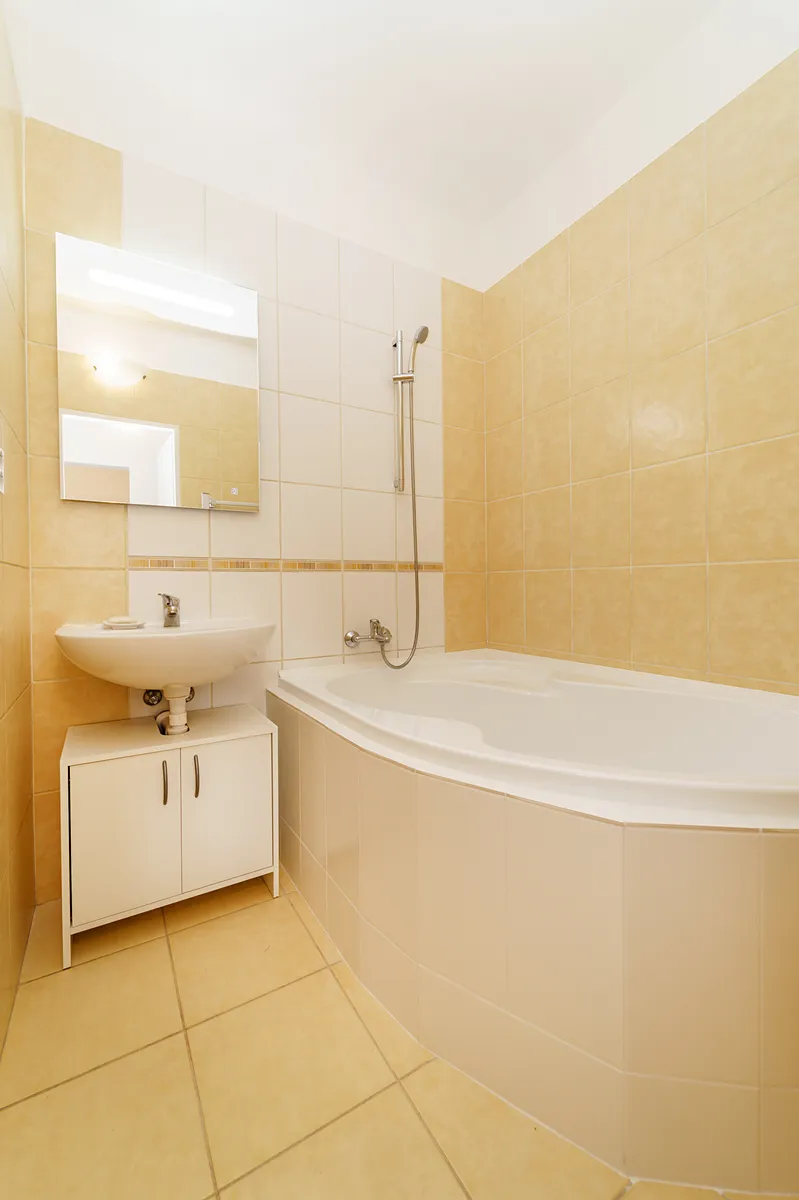 Kuchyně s dostatkem úložného prostoru sousedí s jídelnou plynule přecházející v prostorný obývací pokoj s příjemným výhledem do městské zeleně. Vedle obývacího pokoje je umístěn samostatný pokoj vhodný jako ložnice s prosklenou lodžií a chodba s přístupem do dalších dvou oddělených místností s výhledem na bazén. Větší místnost je možno použít jako druhou ložnici nebo dětský pokoj. Nejmenší místnost se zabudovanou velkou vestavěnou skříní je možno využít jako pracovnu a šatnu nebo pokoj pro hosty. Z chodby je také přístupná větší koupelna s WC v jedné místnosti.