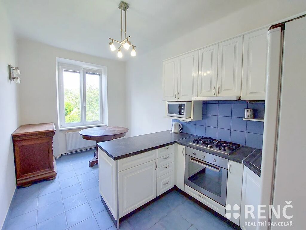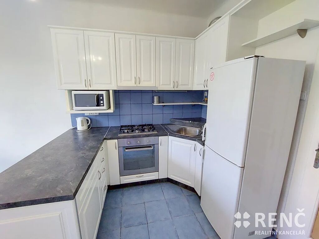 Součástí bytu je kuchyňská linka včetně digestoře, kombinovaného sporáku, lednice, varné konvice a mikrovlnné trouby.