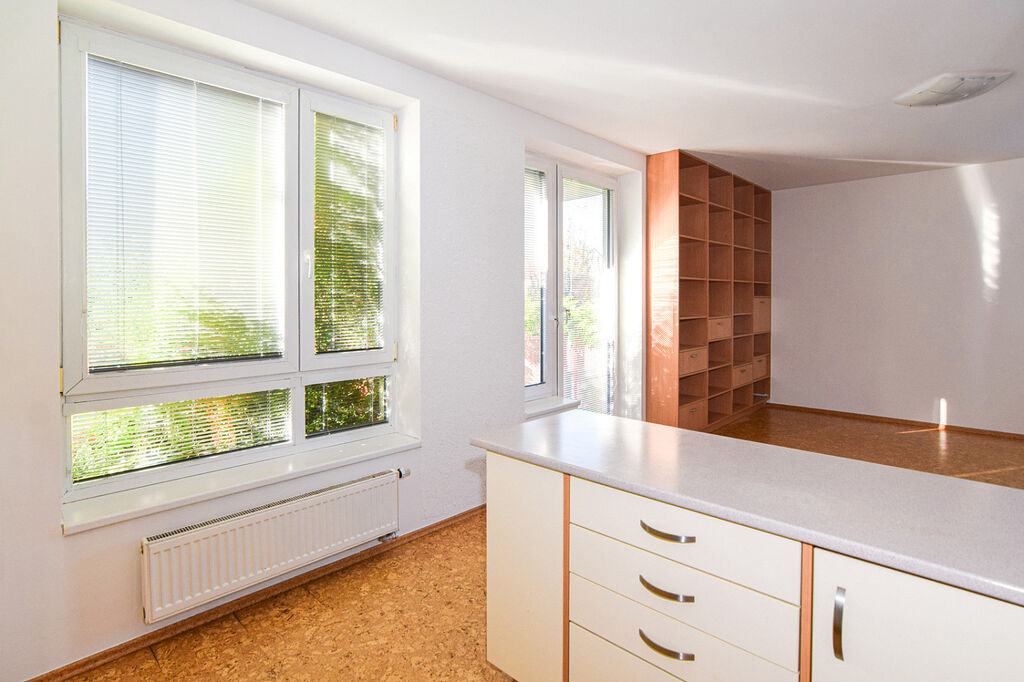 Na podlaze je korková podlaha v kombinaci s dlažbou. Okna jsou plastová s žaluziemi.