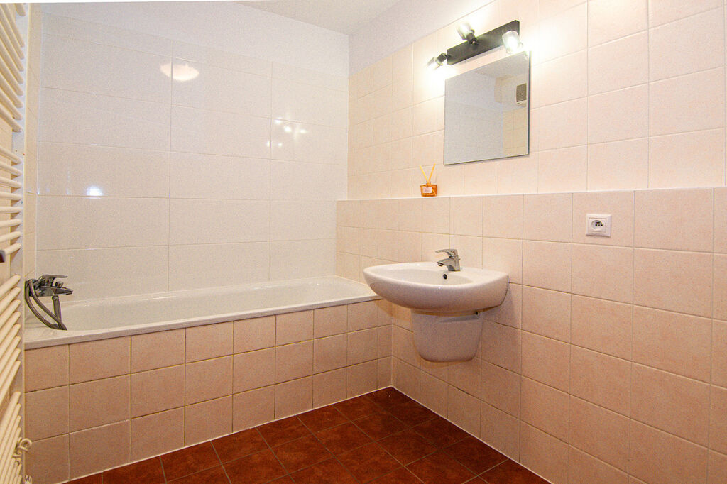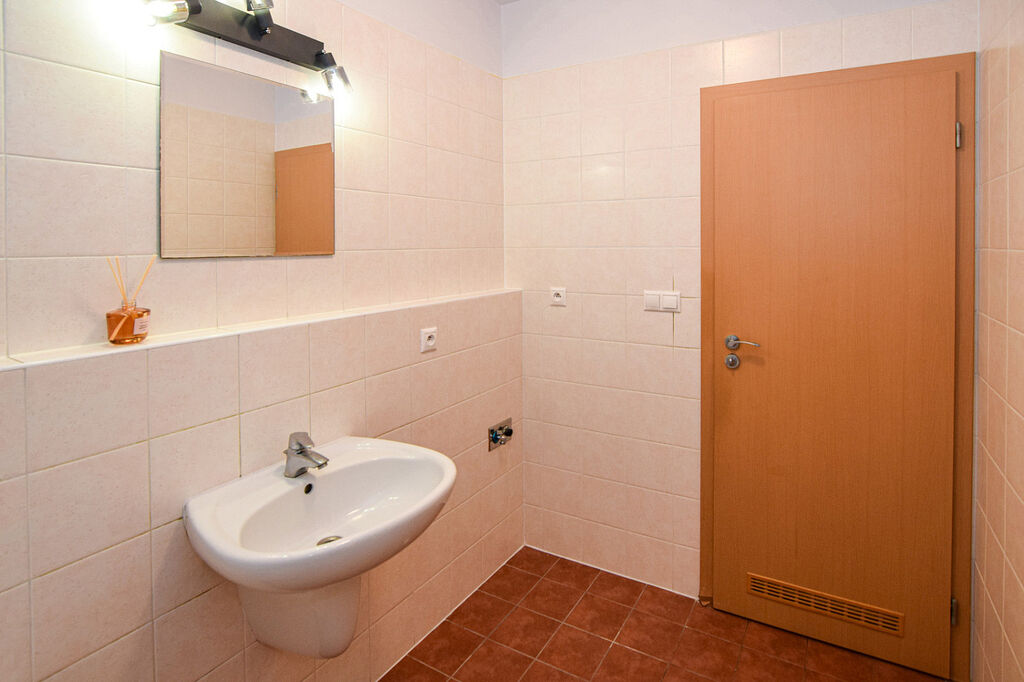 Koupelna disponuje vanou a pohodlně se zde umístí pračka i sušička. Toaleta je samostatná.