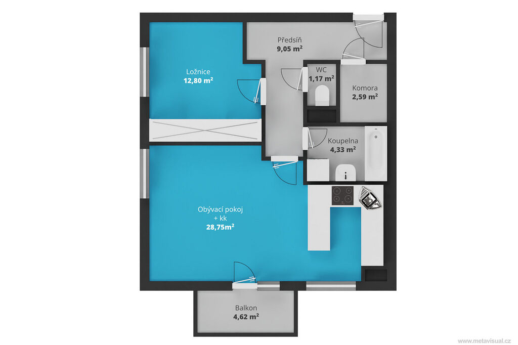 Podlahová výměra bytu činí 59 m² + balkon o výměře 5 m².