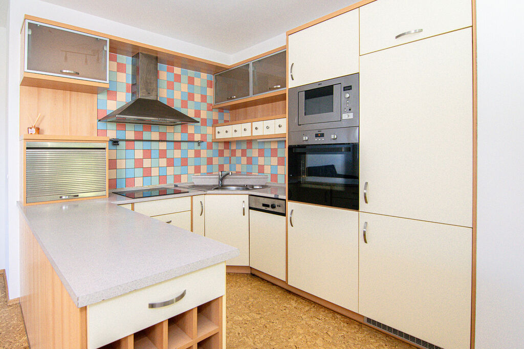 Kuchyňská linka do tvaru U disponuje veškerými vestavnými spotřebiči. Je zde dostatek úložného prostoru.